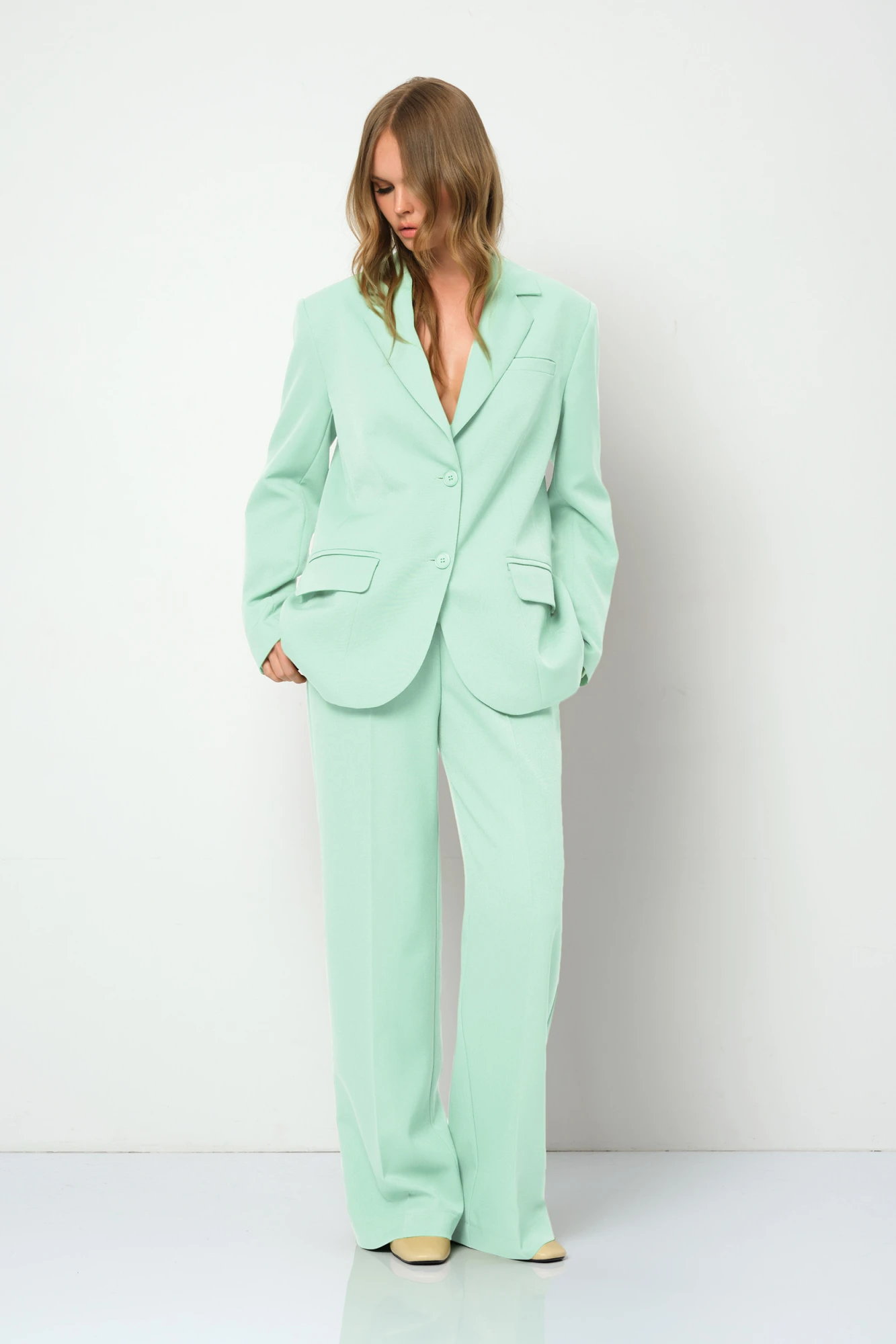 "Костюм-тройка из оверсайз жакета, топа-корсета и прямых широких брюк со стрелками.