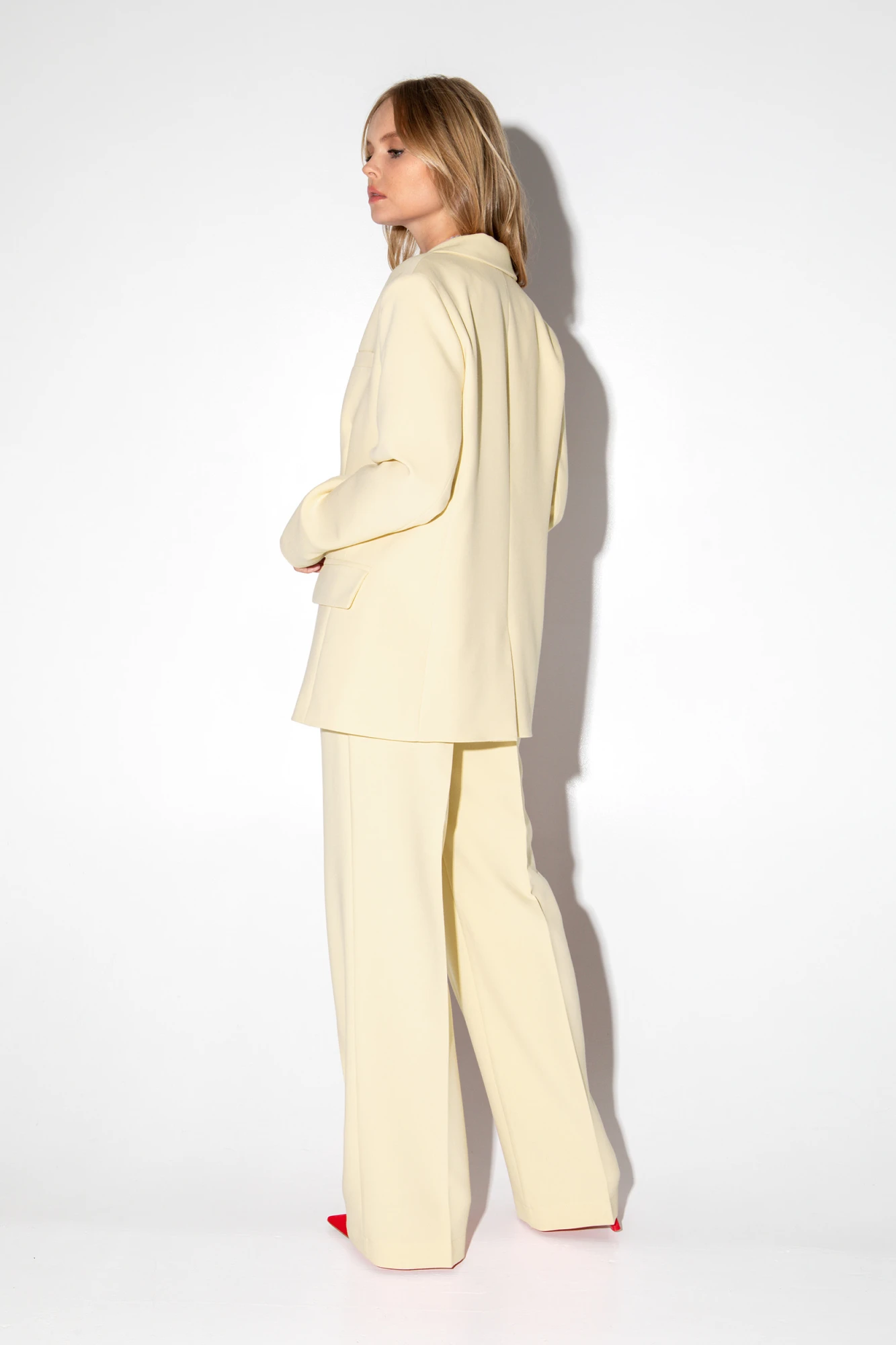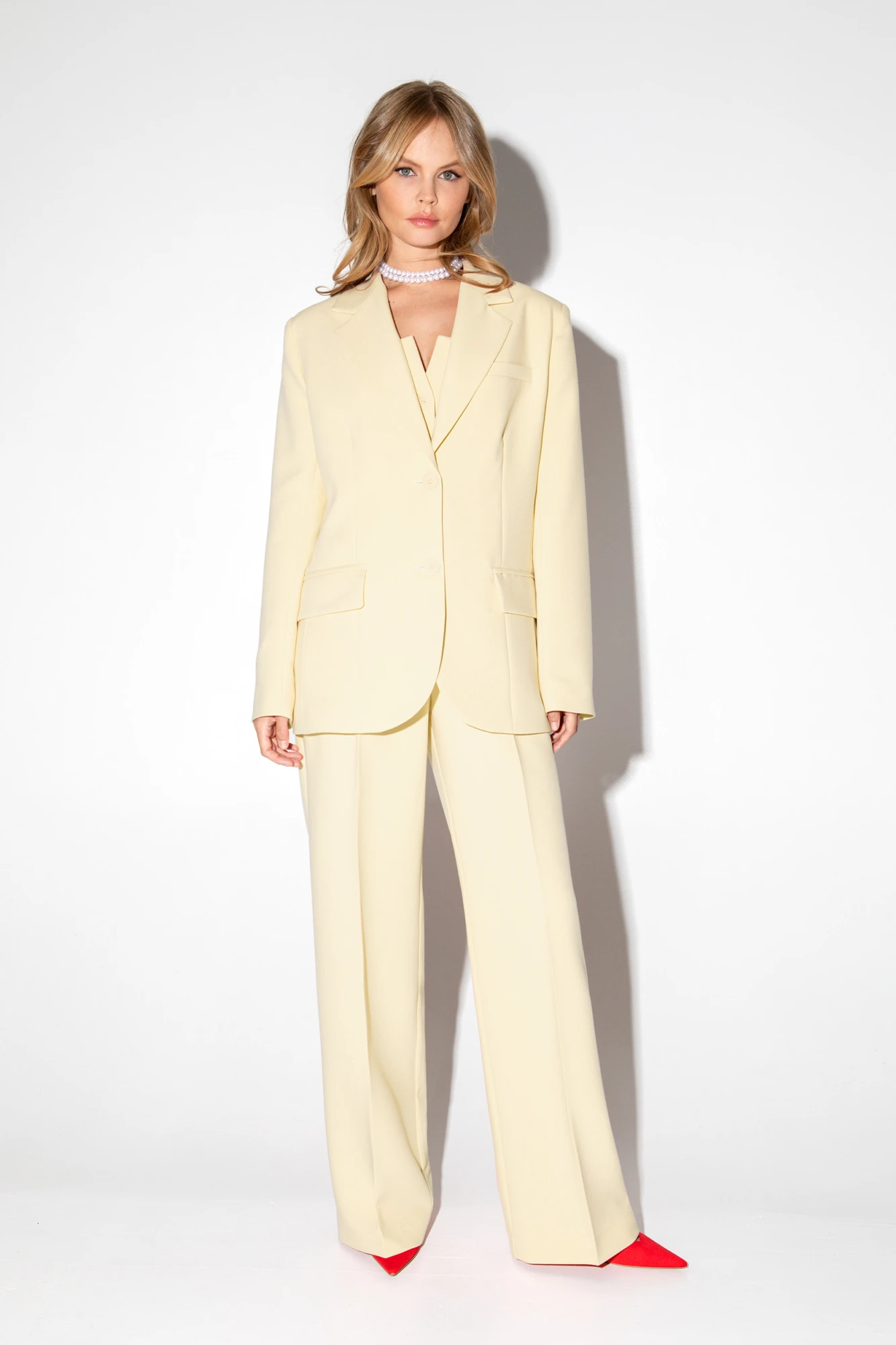 "Костюм-тройка из оверсайз жакета, топа-корсета и прямых широких брюк со стрелками.