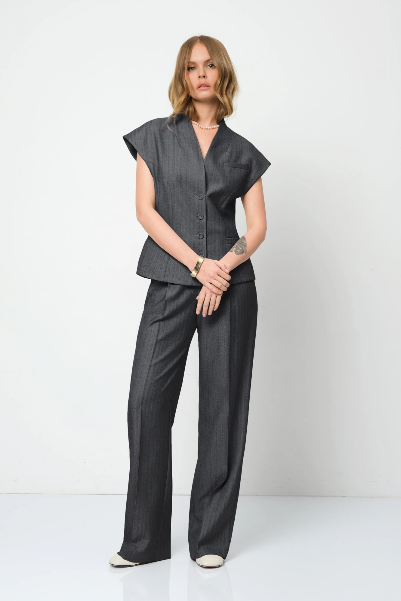 "Костюм-двойка из приталенного жилета с воротником-стойкой и широких прямых брюк из текстильной ткани с рисунком «ёлочка».