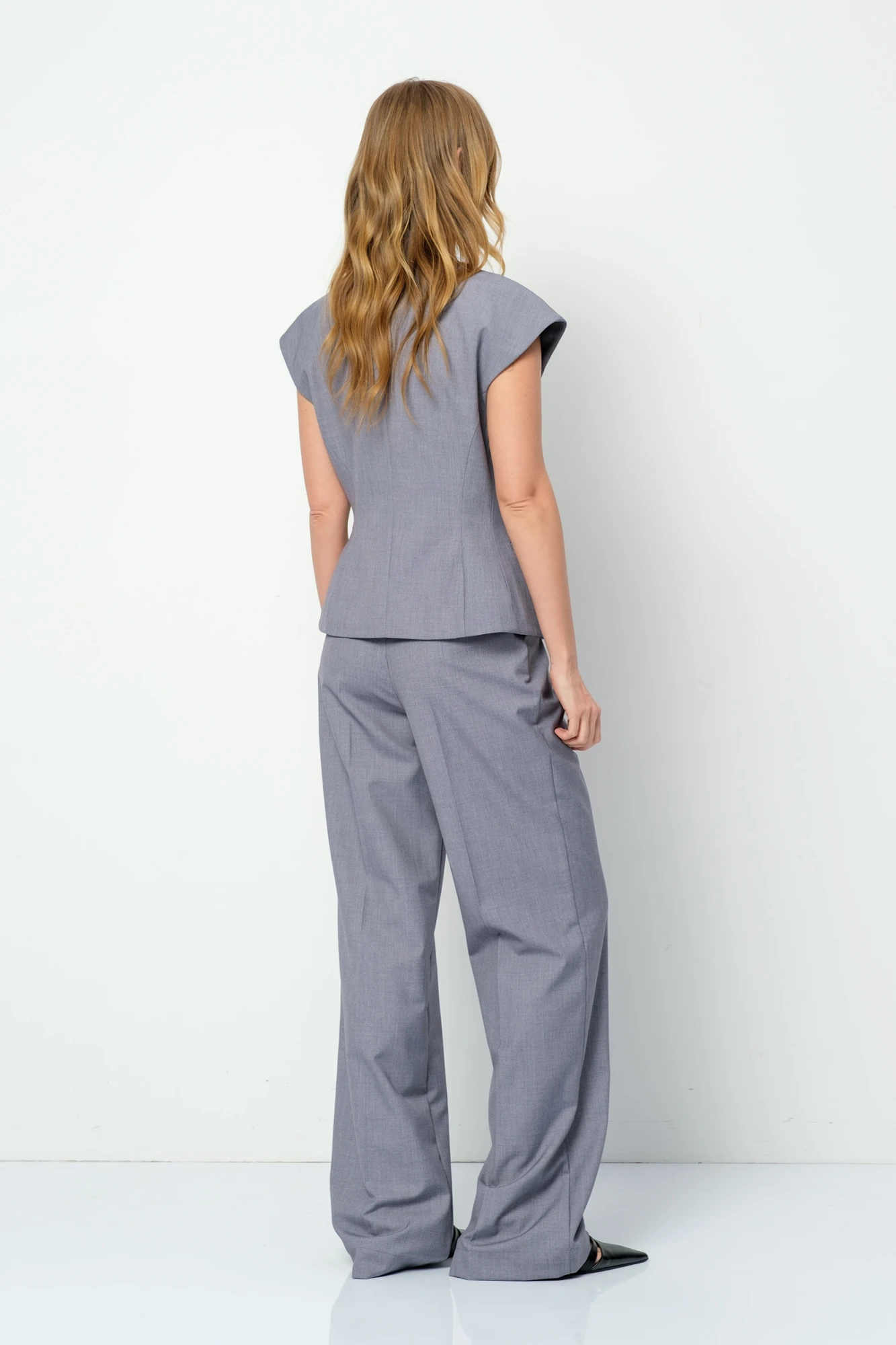 "Костюм-двойка из приталенного жилета с воротником-стойкой и широких прямых брюк.