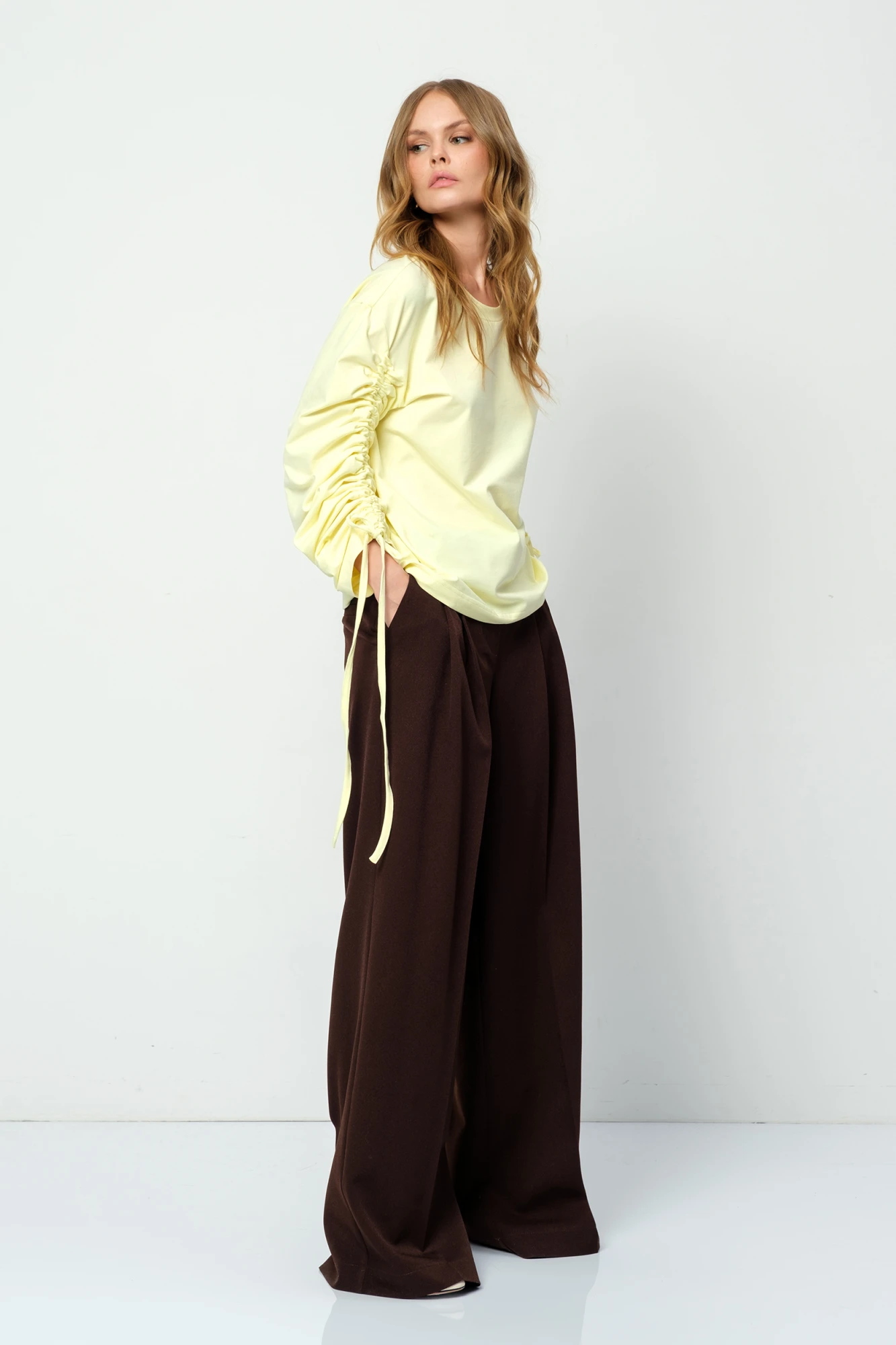 "Комплект-двойка из трикотажного свободного свитшота с объемными рукавами и брюк-палаццо из текстильной ткани.