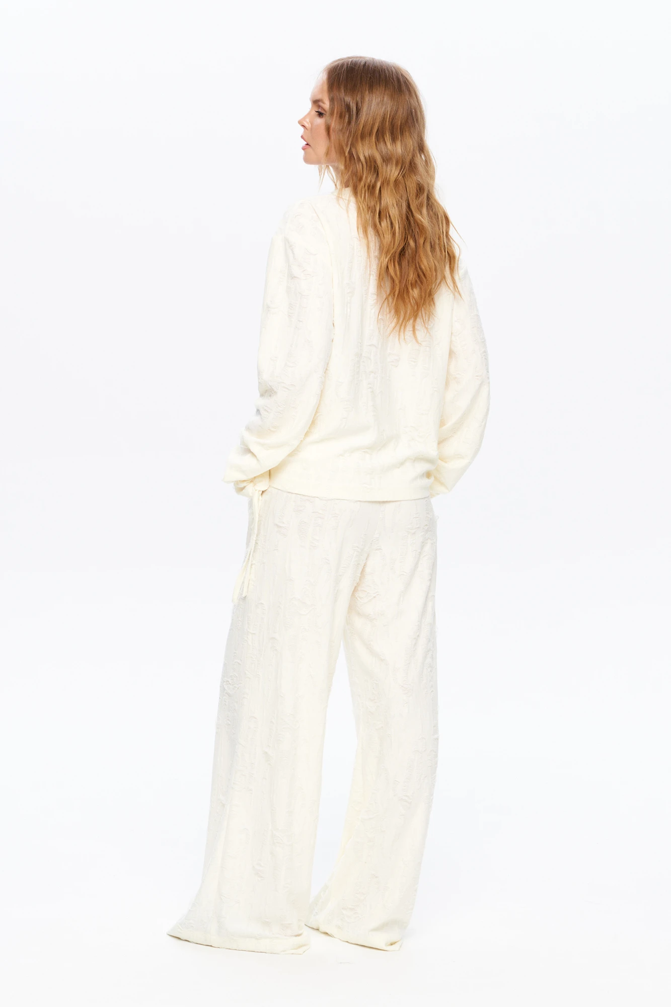 Комплект-двойка из свободного свитшота с объемными рукавами и широких брюк из фактурного трикотажа.
