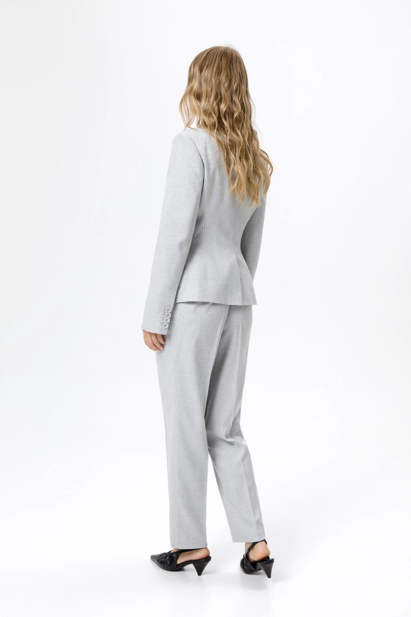 Костюм-двойка из укороченного приталенного жакета с акцентными карманами и укороченных классических брюк со стрелками.