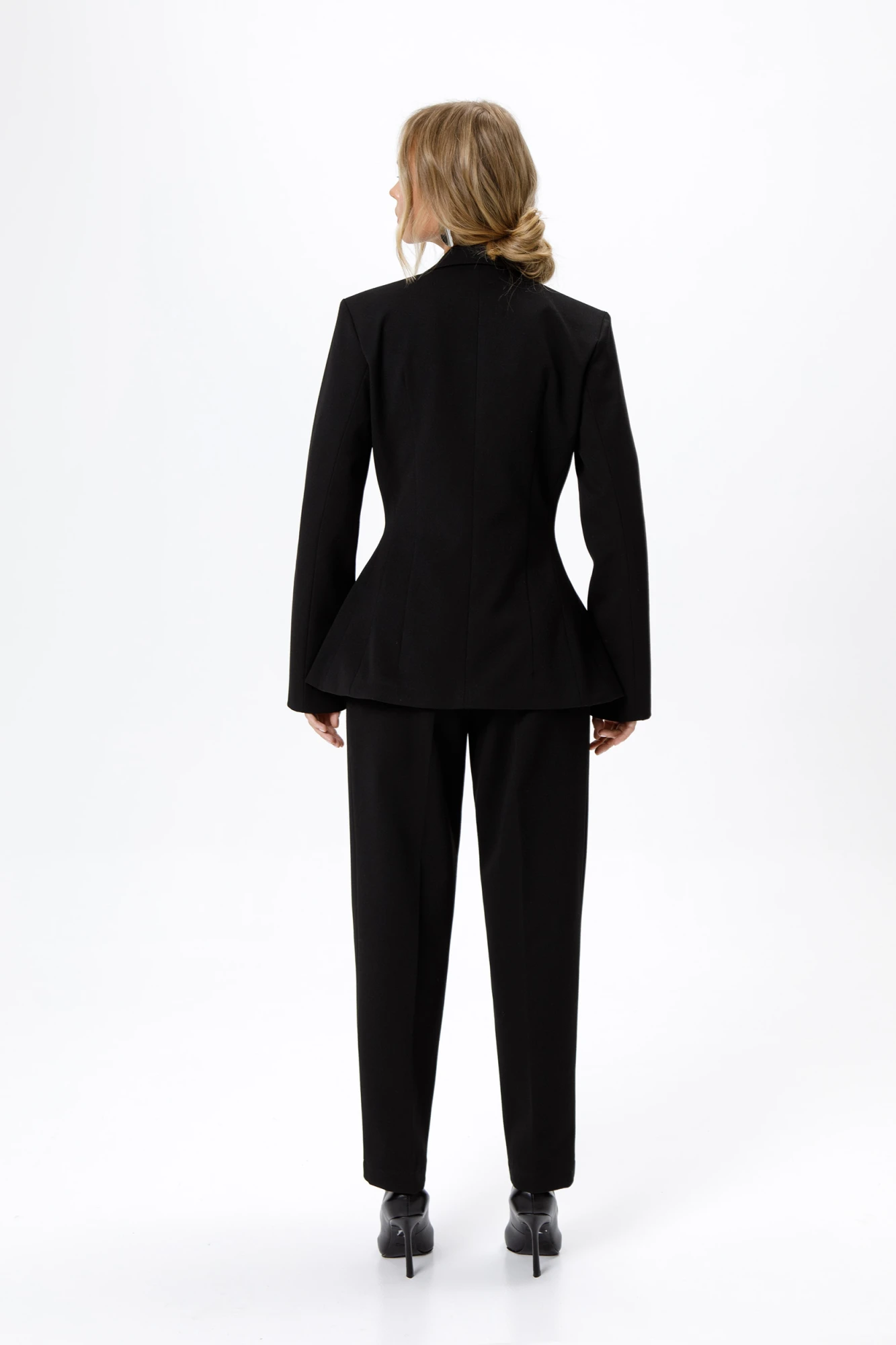 Костюм-двойка из приталенного жакета с молниями и укороченных классических брюк со стрелками.