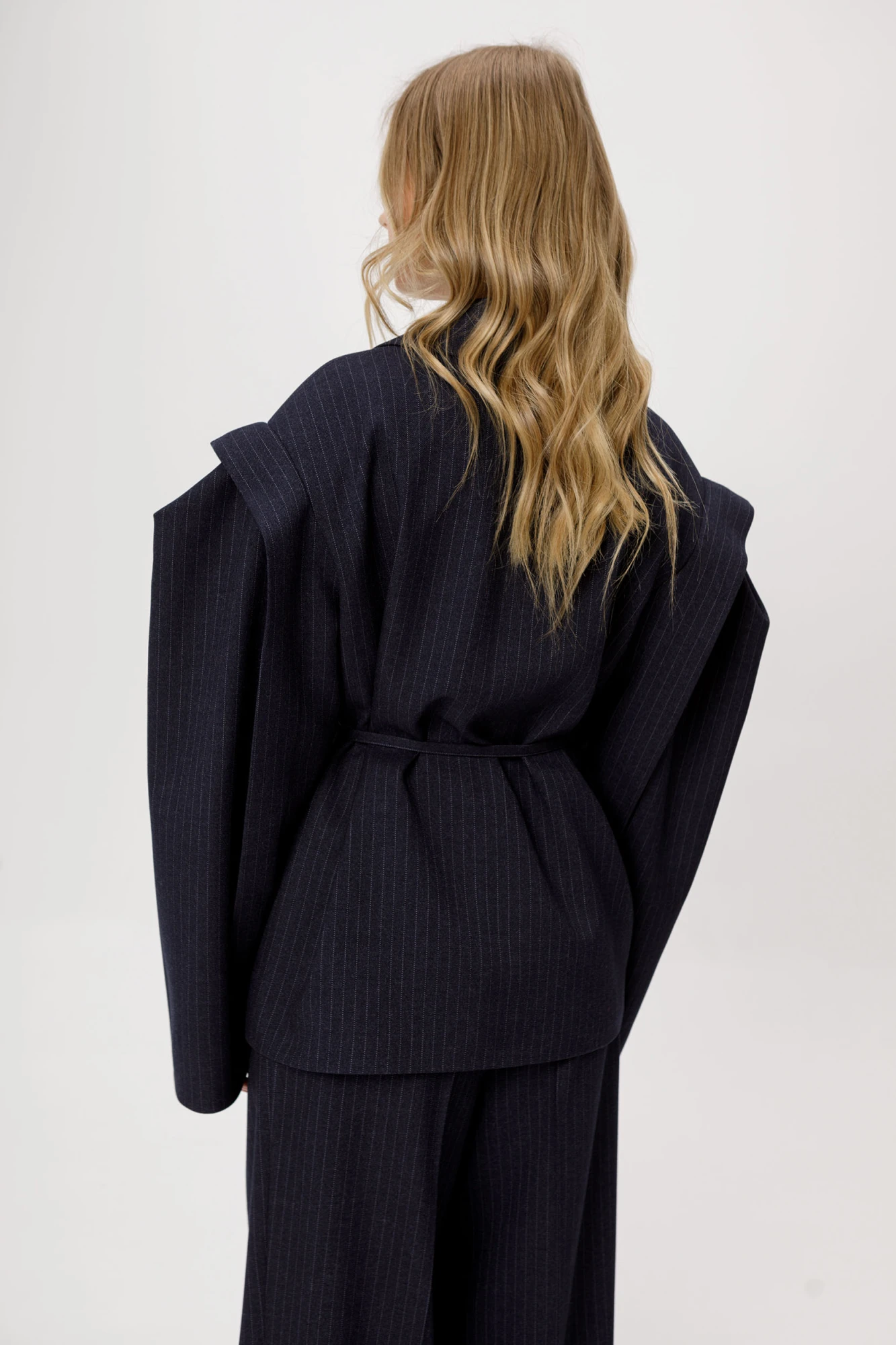 Костюм-двойка из оверсайз жакет со съёмным поясом и широких брюк-палаццо из текстильной ткани в полоску.