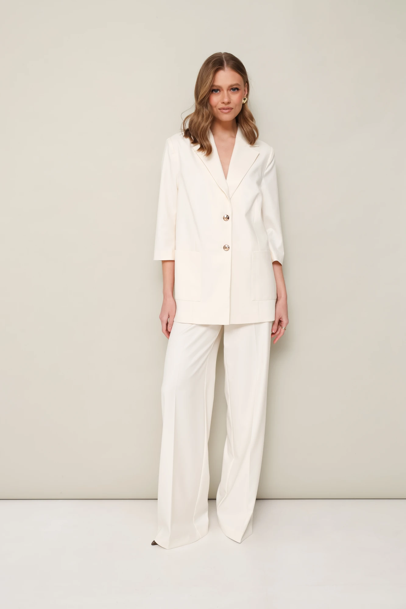 "Стильный комплект, состоящий из жакета и брюк. Жакет современного прямого силуэта из костюмной ткани с центральной застёжкой на петли и пуговицы. Воротник пиджачного типа с отложными лацканами. Спереди обработаны накладные карманы. Спинка с V-образным вырезом, который зашнурован акцентной декоративной тесьмой. Рукава втачные, длина 3/4. Изделие на х/б подкладке. Брюки прямого силуэта из костюмной ткани с заутюженными стрелками. Пояс притачной с застежкой на пуговицу и тесьму-молнию, сзади на резинке.