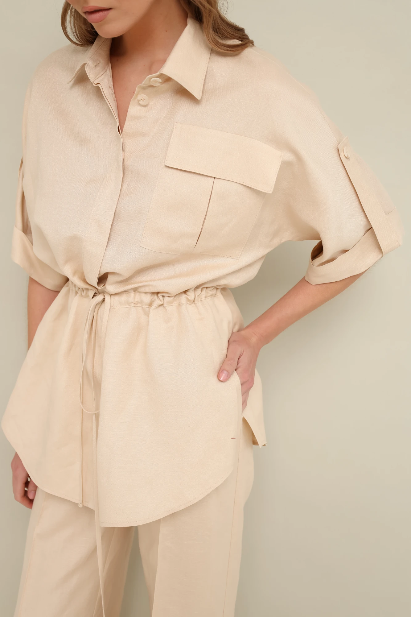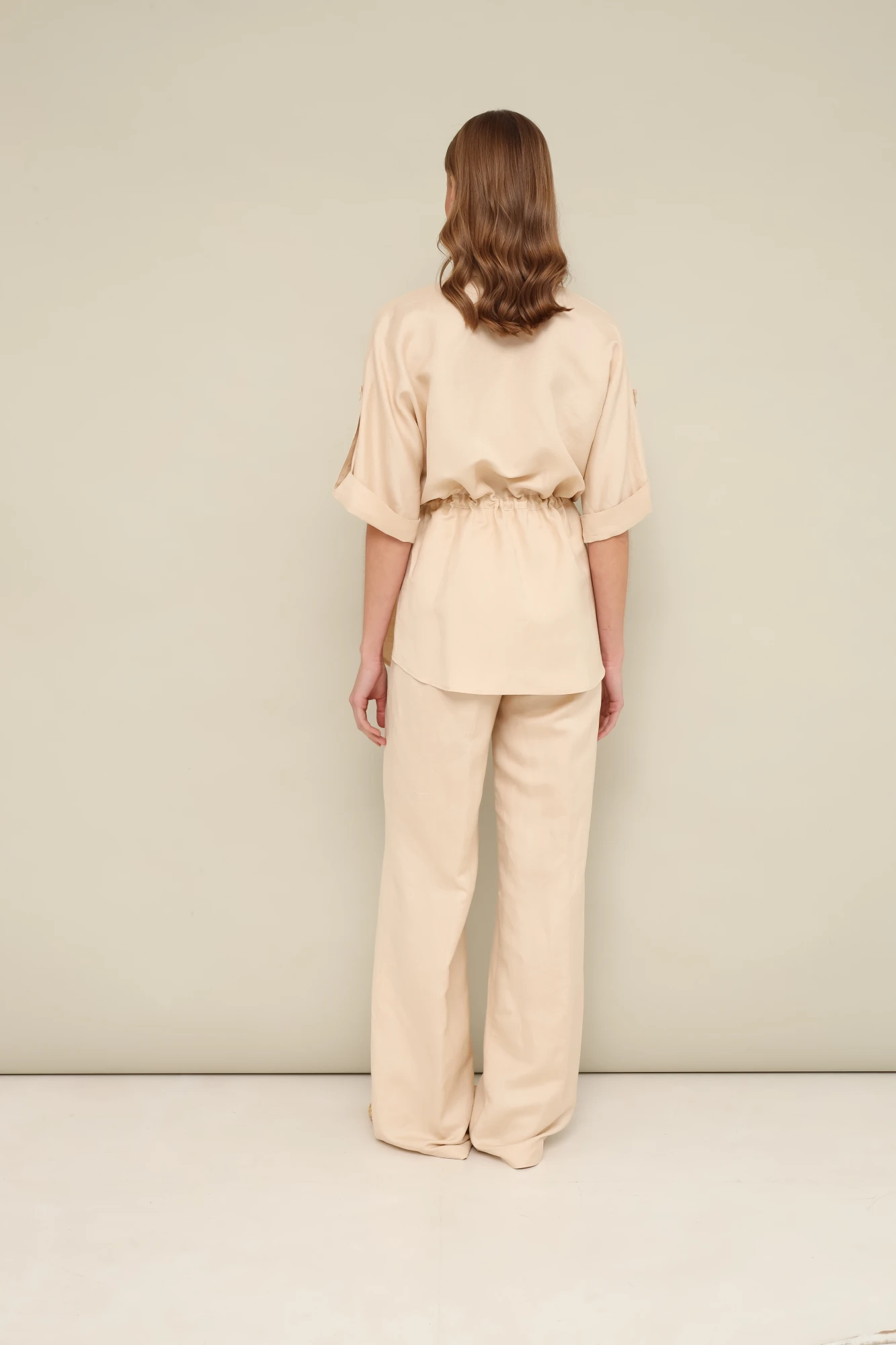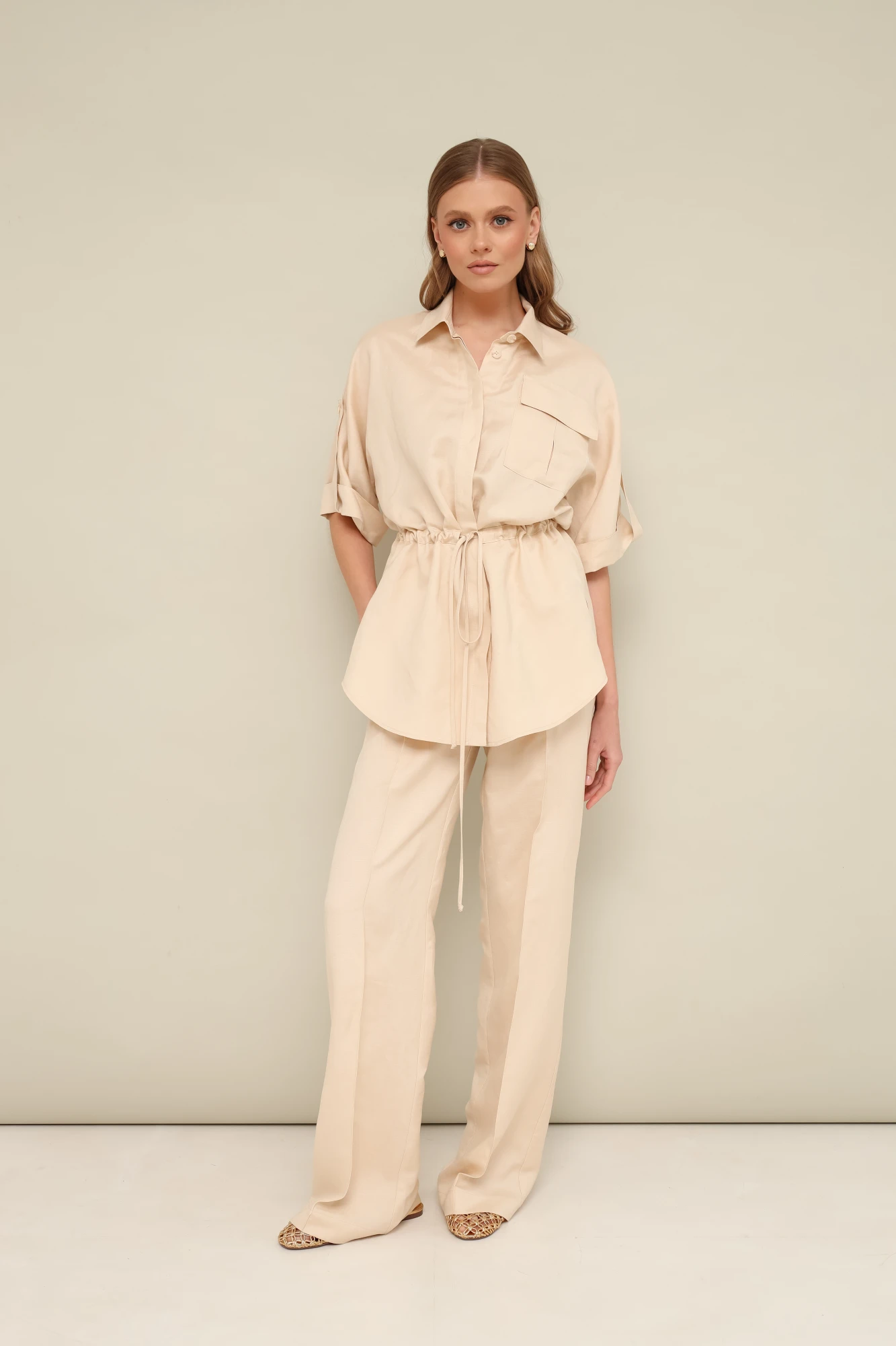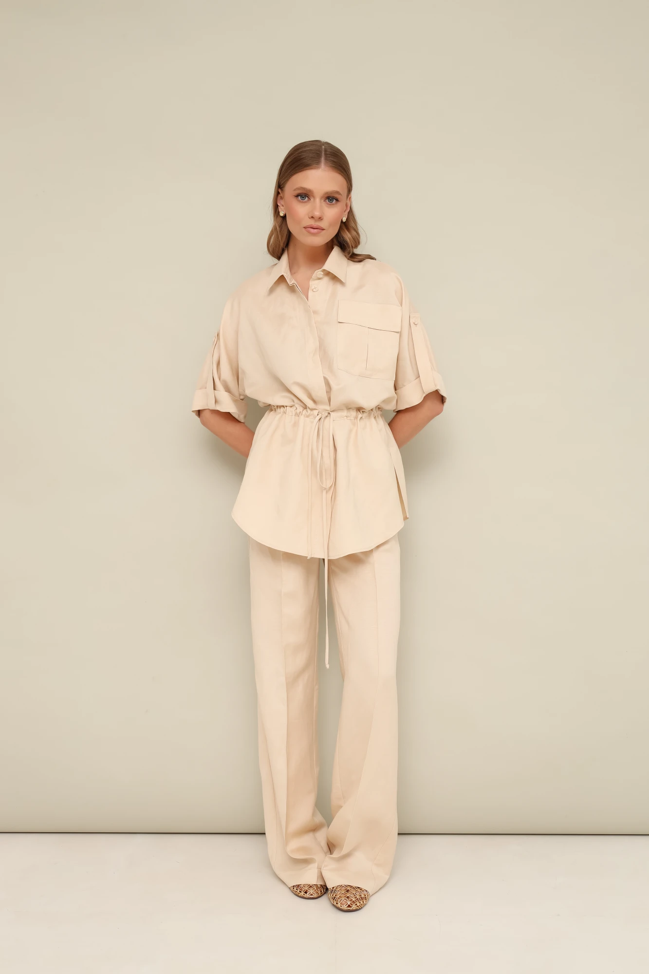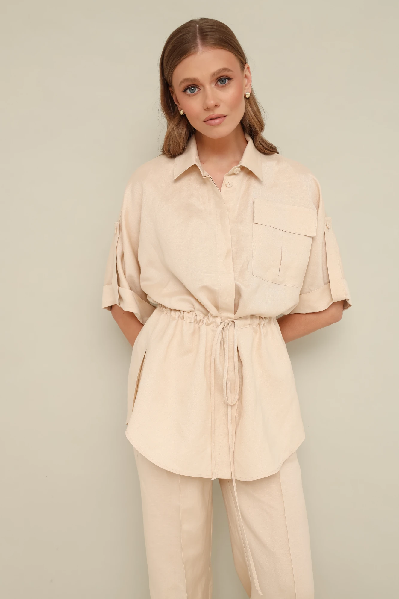 Льняной 2-предметный комплект актуального кроя, состоящий из блузки и брюк. Блузка прямого силуэта с кулисой на талии. Отложной воротник со стойкой, застежка центральная на петли и пуговицы. Спереди обработан накладной карман с клапаном. Рукава с подгибкой на пату, со спущенной линией втачивания плеча . В боковых швах по низу обработаны разрезы. Брюки прямого силуэта с отстроченными стрелками и с боковыми наклонными карманами. Пояс притачной с застежкой на пуговицу и молнию, по спинке пояс с резинкой для регуляции размера. На задних половинках брюк прорезные карманы с листочками. Длина брюк разработана с учетом усадочных свойств натуральной ткани.