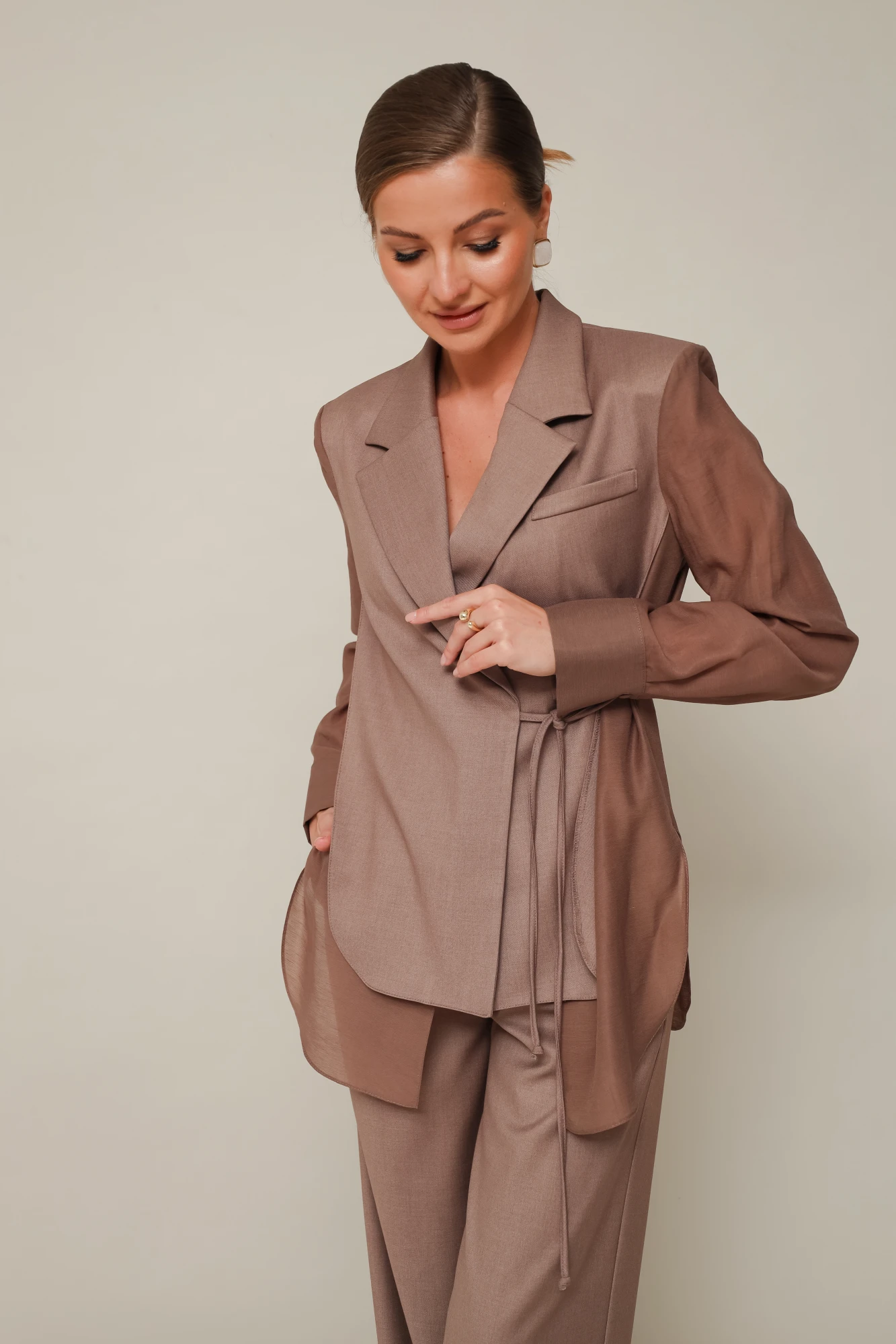 Элегантный 2-предметный комплект, состоящий из жакета и брюк, выполненный из костюмной и вискозной блузочной ткани. Жакет актуального прямого силуэта, с центральной застежкой на потайную пуговицу и завязками от бокового шва. Воротник пиджачного типа с отложными лацканами. Рукава втачные, с манжетами с застежкой на петли и пуговицы. Спинка с отрезной кокеткой. Рукава, спинка и частично перед, выполнены из легкой блузочной ткани. Брюки с посадкой на талии и защипами от пояса, с заутюженными стрелками и с боковыми наклонными карманами. Пояс притачной с застежкой на пуговицу и тесьму-молнию, по спинке пояс на резинке для регуляции размера.