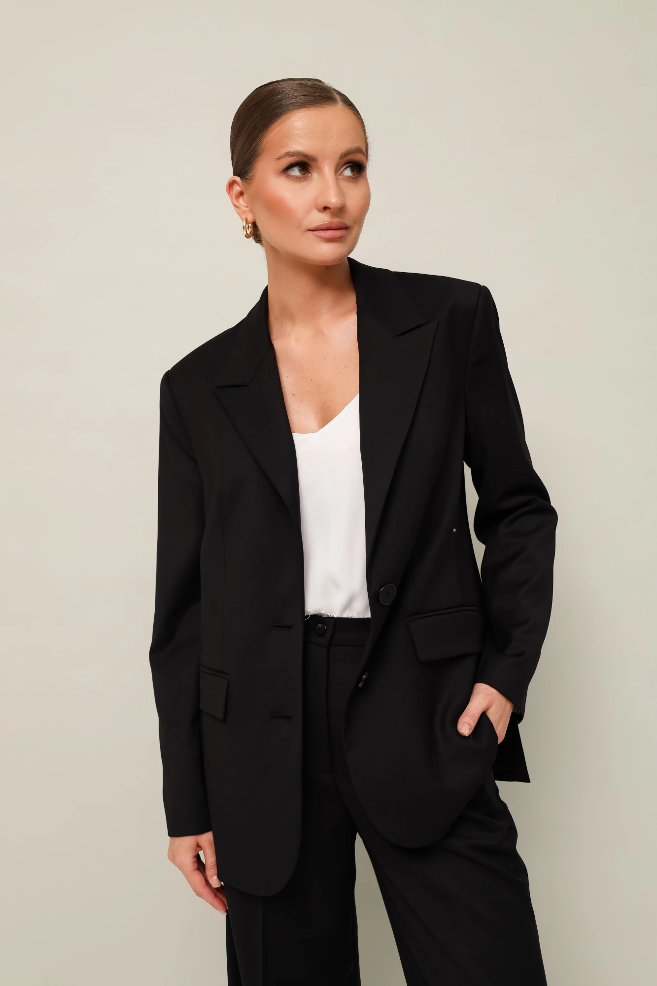 "Стильный 2-предметный комплект, состоящий из жакета и брюк, выполнен из качественной костюмной ткани.