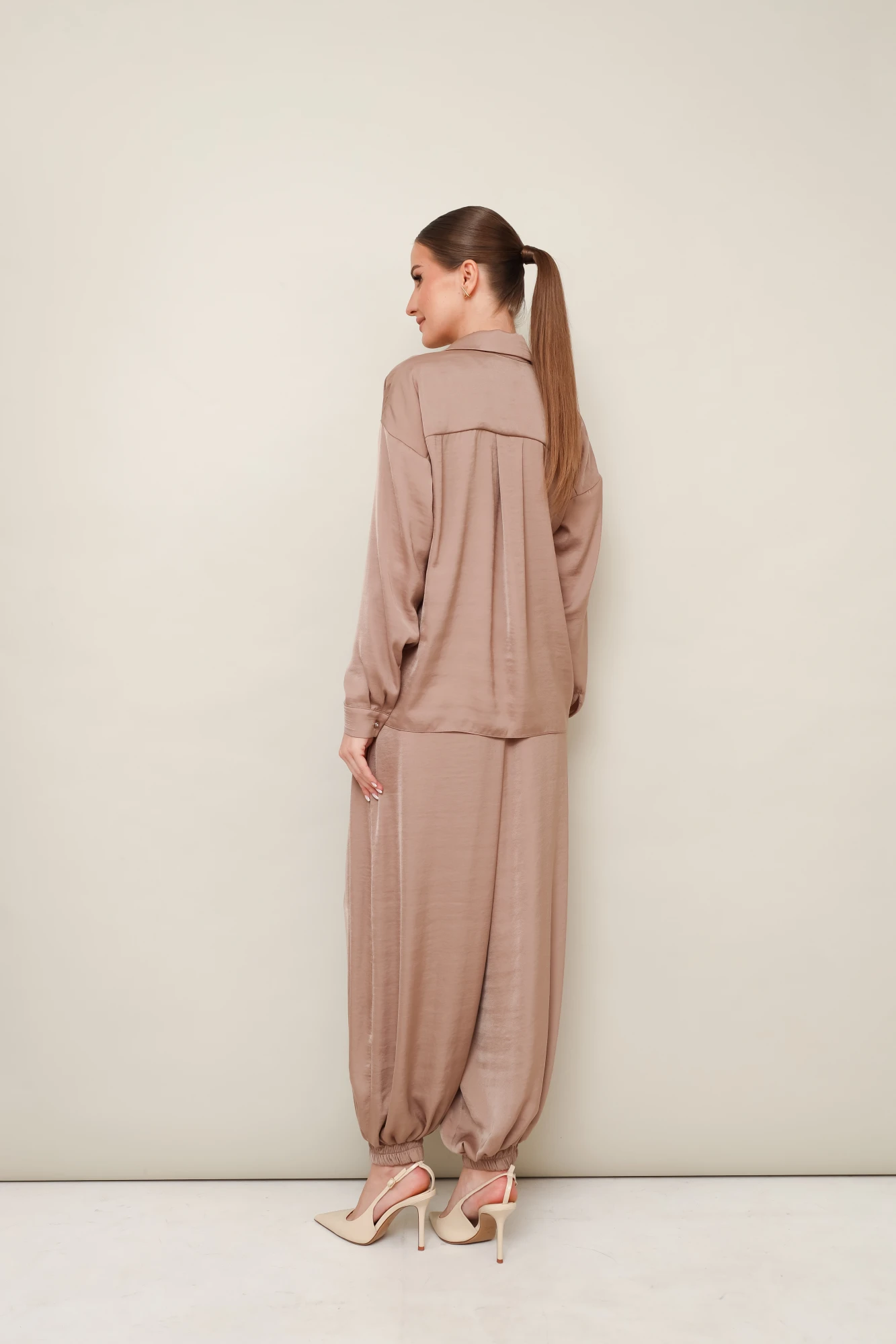 Комфортные брюки-алладины свободного силуэта с боковыми наклонными карманами. Притачной пояс и манжеты на резинке.