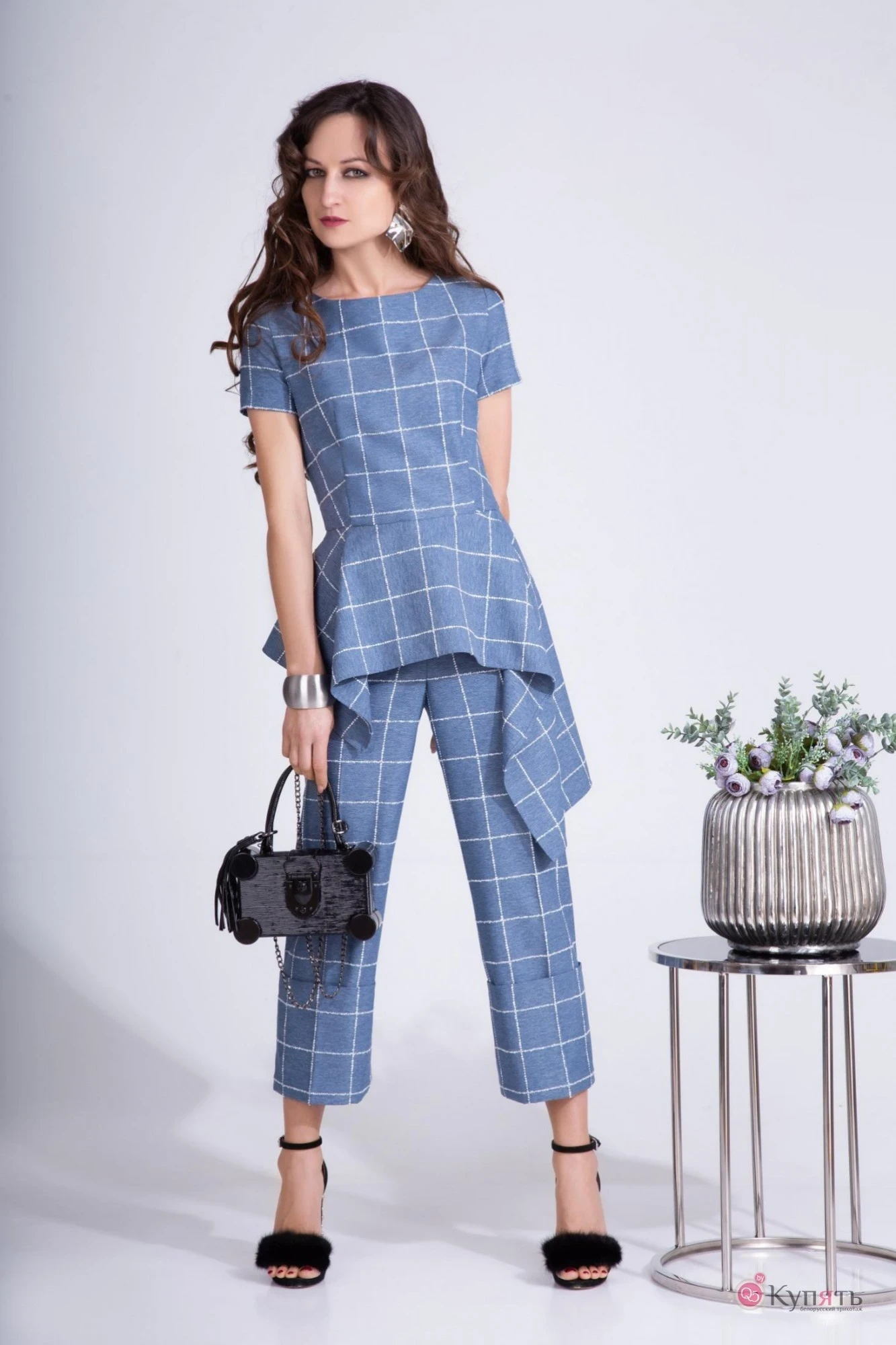 Ассиметричный крой становится модным трендом сезона далеко не в первый и точно не в последний раз. Благодаря ассиметричной баске блузка превращается в сложную, нестандартную вещь, ассоциирующуюся с яркими женщинами. По конструкции блузка прилегающего силуэта с ассиметричной баской. Застёжка в среднем шве спинки на потайную молнию. Рукав втачной, короткий. Брюки - кюлоты, прямого силуэта, с широкой цельнокроеной манжетой по низу, позволяющей регулировать длину. Карманы по переду. Притачной пояс со шлёвками, с застёжкой на молнию, крючок, петлю и пуговицу.