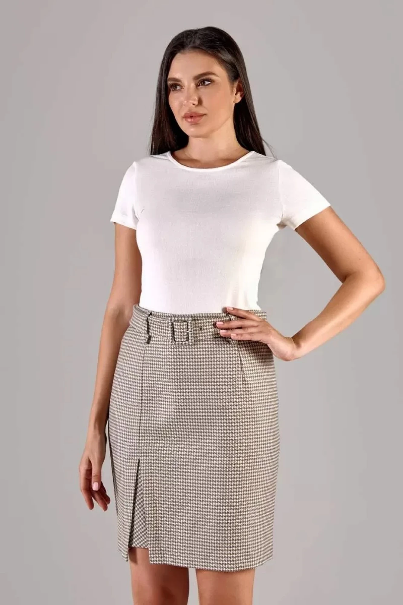 Комплект женский трехпредметный, состоящий из базовой блузы, жакета и юбки. Жакет на подкладке, укороченный, полуприлегающего силуэта. Рукава втачные. Воротник отложной пиджачного типа. Юбка на подкладке, укороченная, полуприлегающего силуэта, по переду разрез из основной ткани. Пояс отрезной со шлевками. Блуза базовая с круглым вырезом по переду и с V-образным вырезом по спинке. В комплекте пояс из основной ткани.