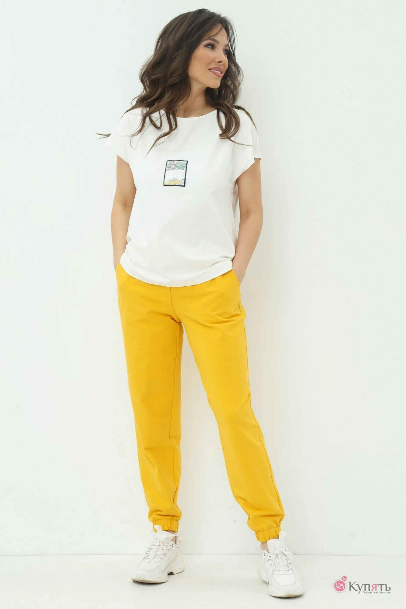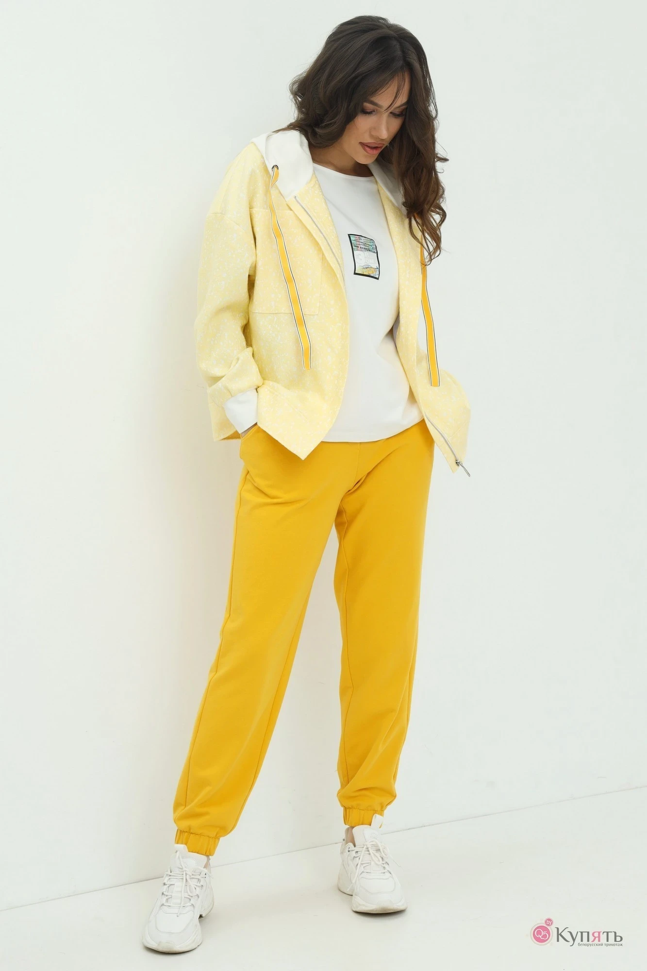 Стильный комплект, состоящий из бомбера, блузы и брюк. Бомбер свободного кроя со спущенным рукавом, с центральной застежкой на молнию. Выполнен из жаккардового полотна. Низ рукава с притачной манжетой, выполненной из однотонного трикотажного полотна. Бомбер дополнен капюшоном и нагрудными карманами. Блуза прямого кроя с коротким цельнокроеным рукавом. Декорирована нагрудной аппликацией. Брюки свободного кроя, на притачном поясе с эластичной тесьмой, дополнены боковыми карманами. Выполнены из однотонного трикотажного полотна. По низу брюки сборены на эластичную тесьму. Длина куртки от плечевого шва 65 см. Длина рукава 64 см. Длина блузы 61 см. Длина брюк по боковому шву 98 см