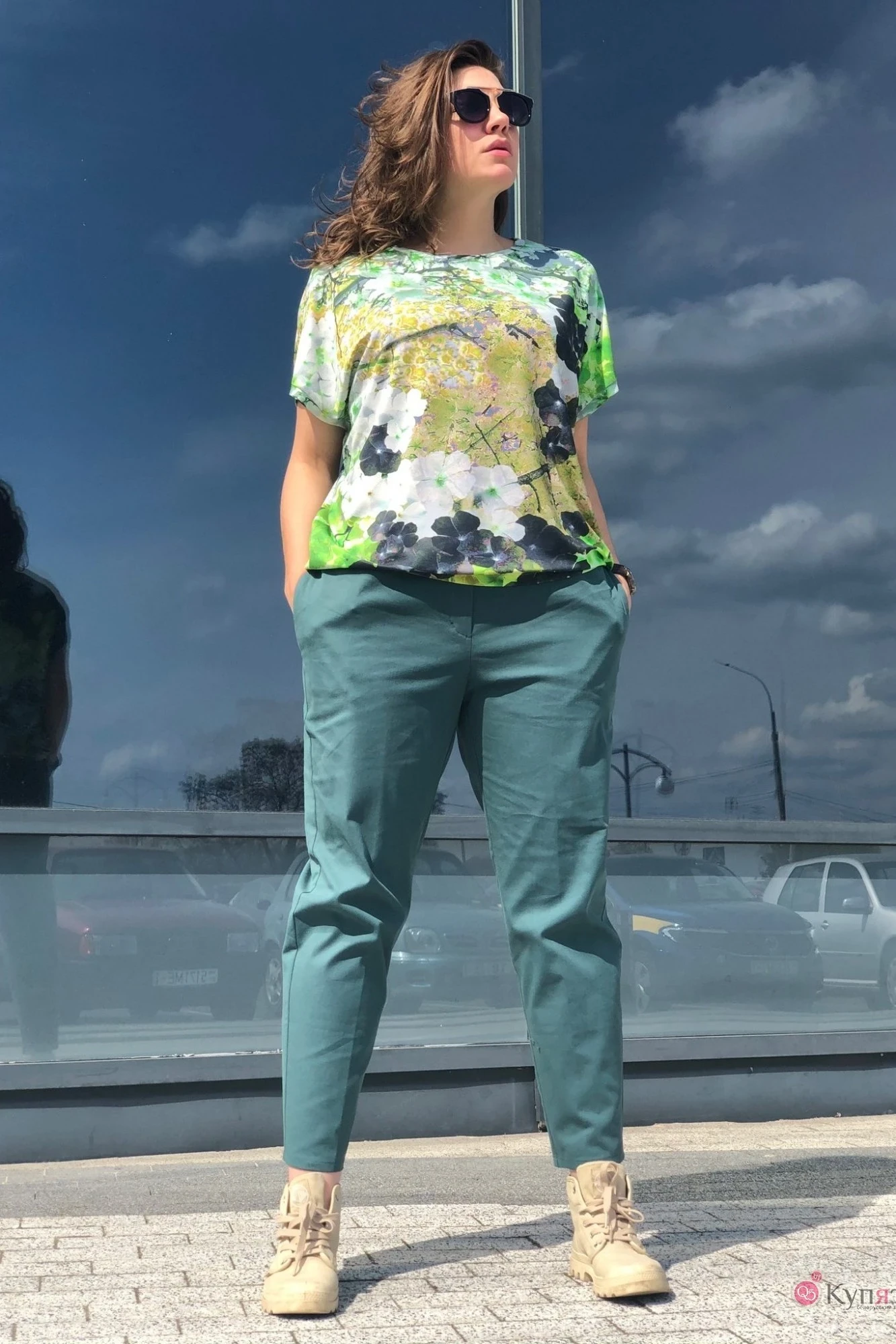 Майка слегка заужена к низу, низ фигурный со спущенным плечом. Брюки укорочены и слегка заужены к низу. Пояс притачной с резинкой, карманы в боковых швах.
