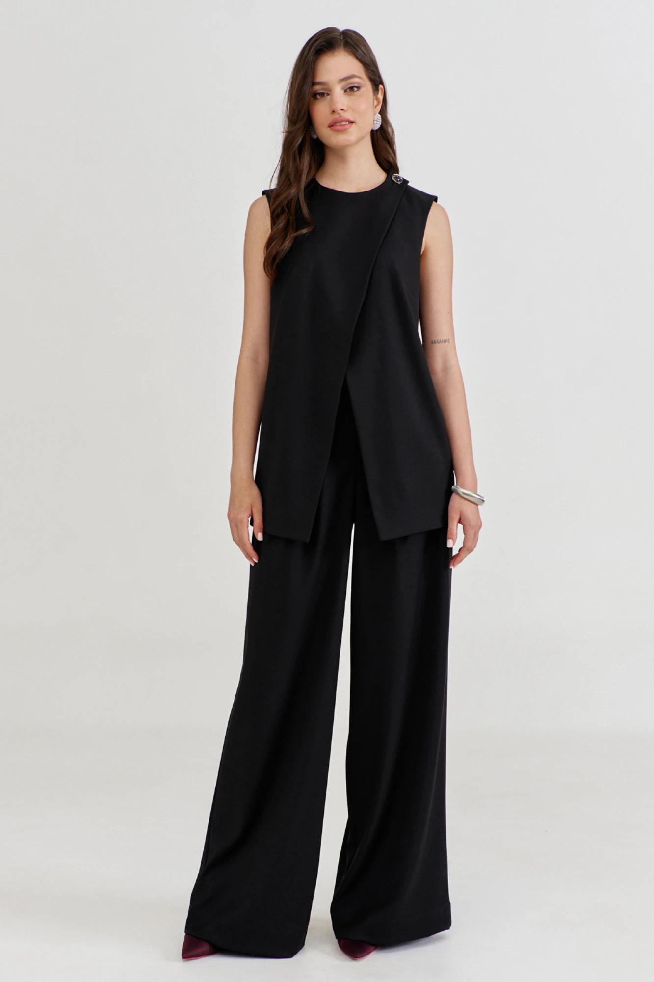 Комплект женский, состоящий из жилетки и брюк. Жилетка свободного кроя, длиной ниже линии бедер. Спинка со средним швом. Перед выполнен на запах, с нагрудными вытачками. Горловина округлой формы, без воротника. Застежка по переду на петлю и декоративную пуговицу на левом плече и потайную – на правом. Жилетка на подкладке. Брюки прямого силуэта, на притачном поясе с резинкой по спинке. По задним половинкам талиевые вытачки. По передним половинкам встречная складка и обработаны боковые карманы с наклонным входом, и застежка на тесьму-«молнию» с гульфиком и откоском. По поясу вставлены шлевки и выполнена застежка на петлю и пуговицу.