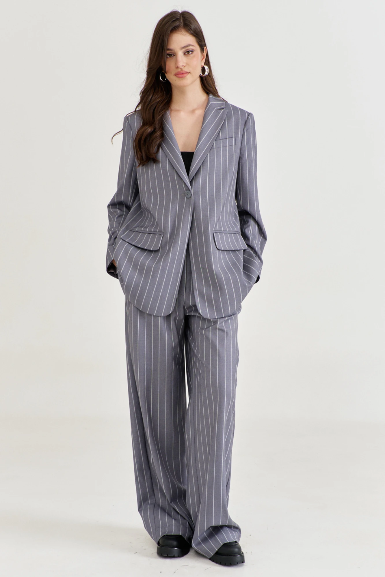 Костюм женский, состоящий из жакета и брюк. Жакет прямого силуэта, длиной ниже линии бедер. Спинка со средним швом, в котором обработана высокая шлица. По переду обработаны карманы «в рамку» с клапаном. В области груди на левом переде обработан карман-обманка с листочкой. Рукава длинные, двушовные, втачные. По низу рукава, в локтевом шве обработана шлица. Воротник пиджачного типа с лацканами. Застежка по переду на петлю и пуговицу. Жакет на подкладке, с плечевыми накладками.