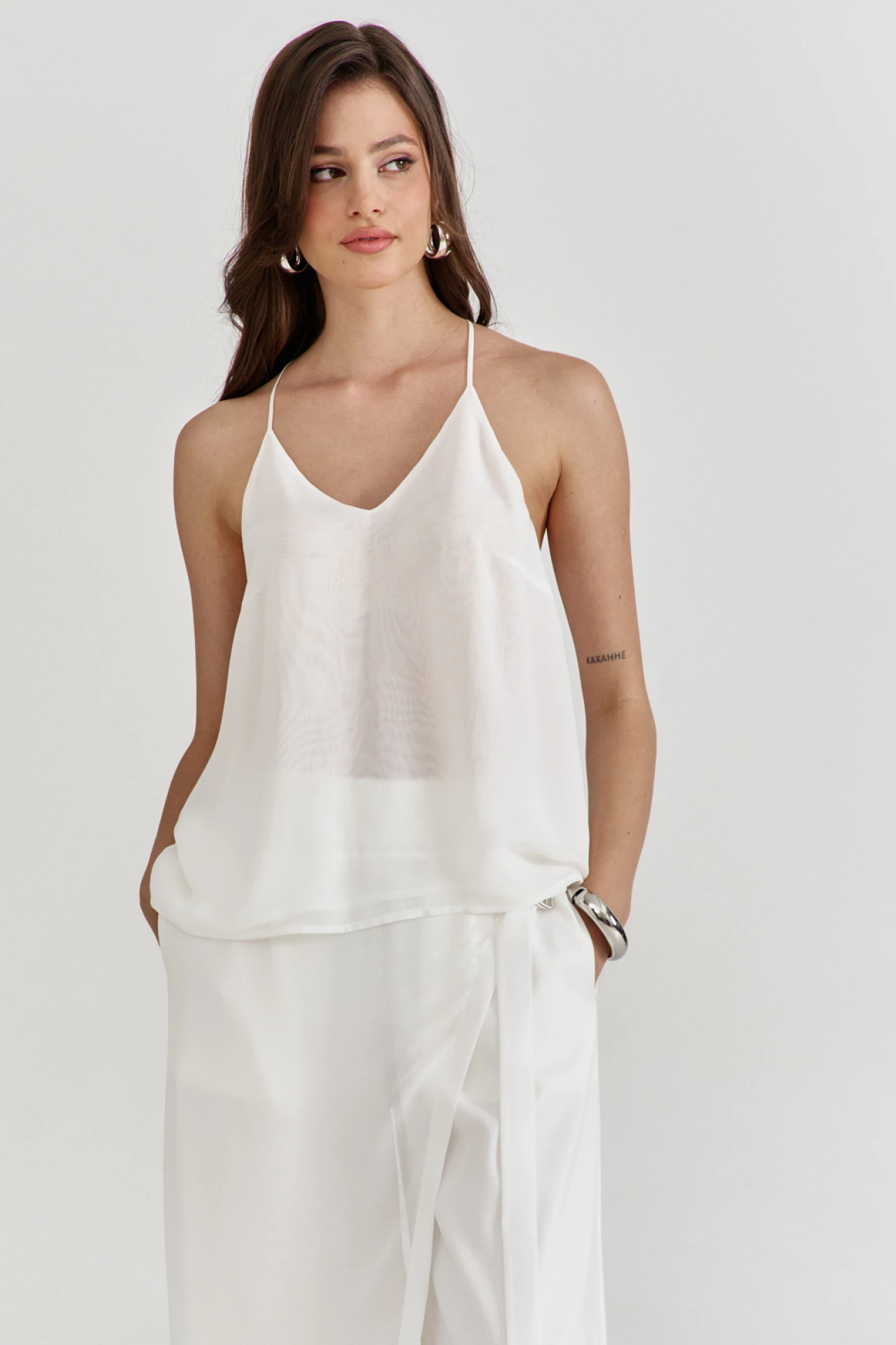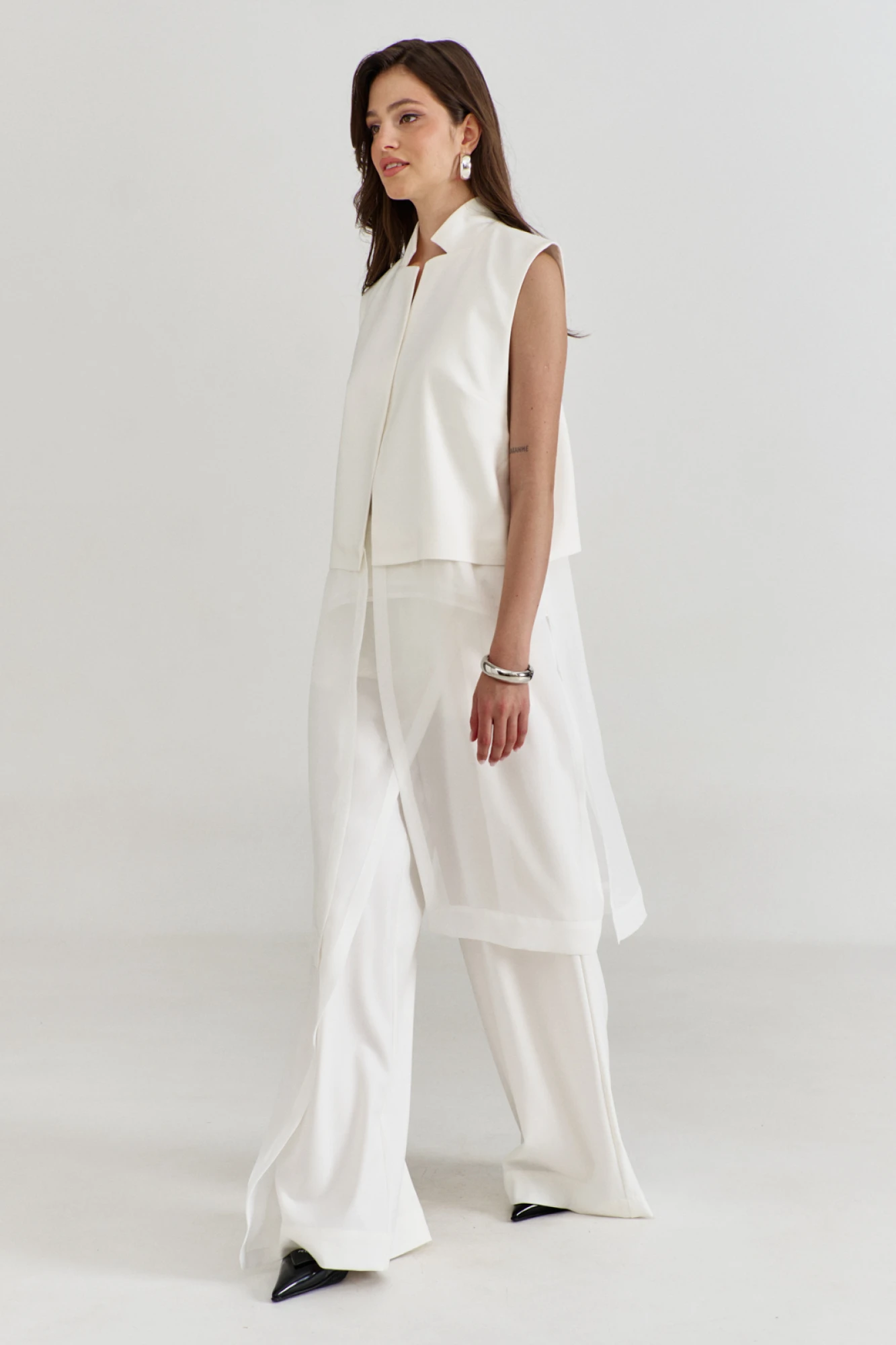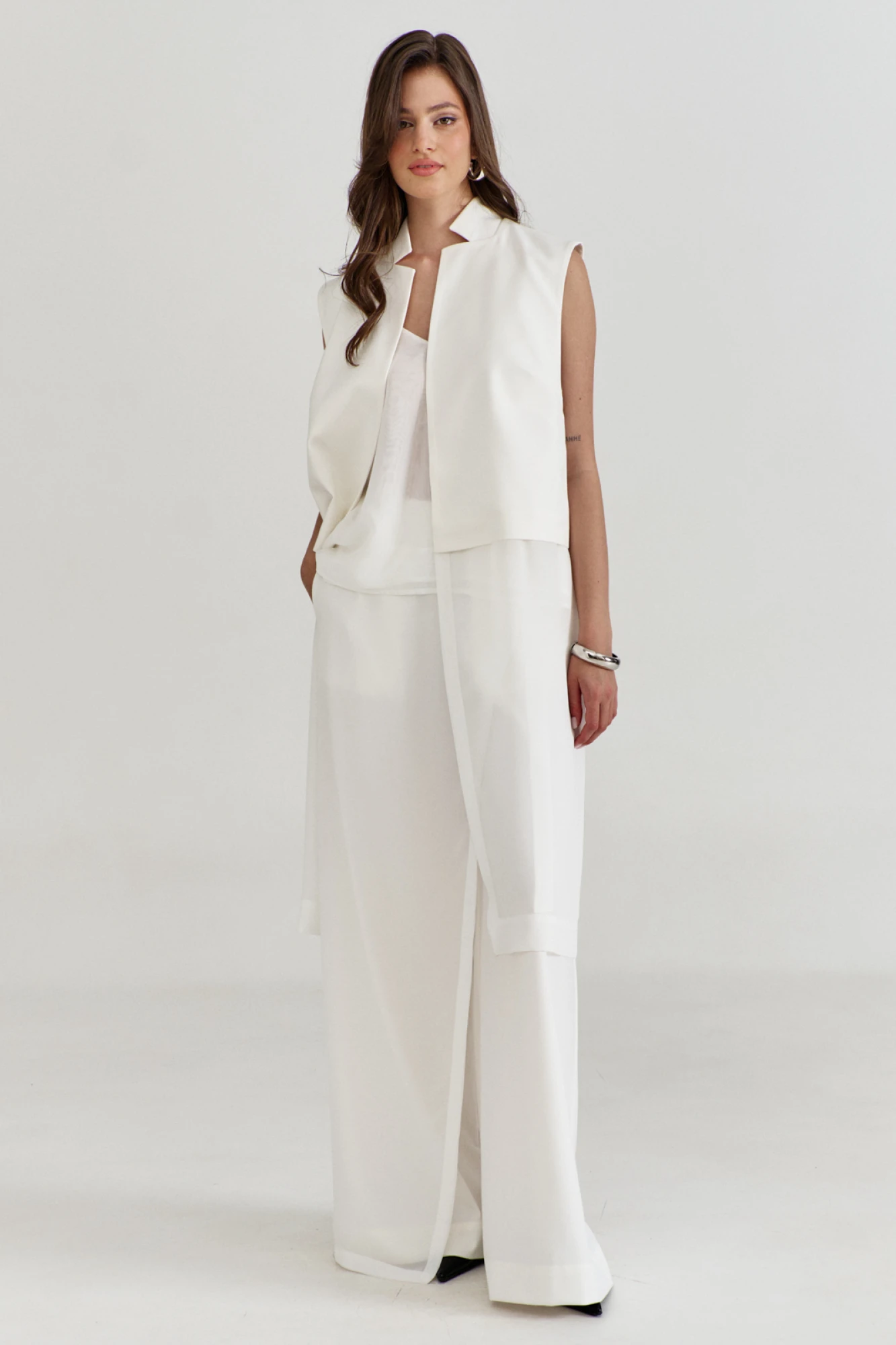 Комплект, состоящий из жилетки, топа и брюк. Жилетка свободного кроя, длиной выше колена. Спинка со средним швом, в котором обработан разрез. Перед с нагрудной вытачкой. Пройма глубокая, квадратной формы. Воротник пиджачного типа со стойкой. Жилетку дополняет шифон по спинке и переду. Жилетка без застежки на подкладке. Топ на бретелях, двойной, длиной выше бедер, с неровной линией низа (спинка удлинена). По переду топа нагрудные вытачки. Брюки длинные, широкие, на притачном поясе с резинкой. По спинке талиевые вытачки. По переду, с правой стороны, вставлена деталь из шифона, выполнена в виде запаха, которая крепится с левой стороны при помощи пояска и паты с полукольцами. В боковых швах обработаны карманы.