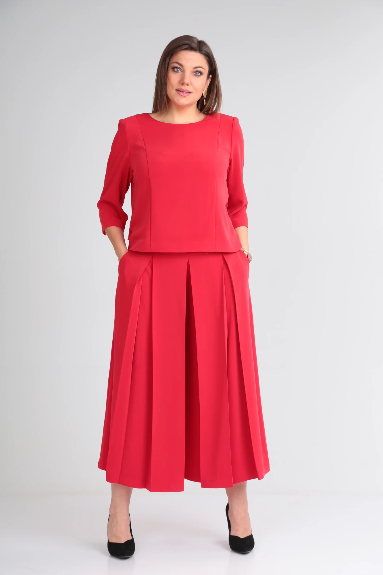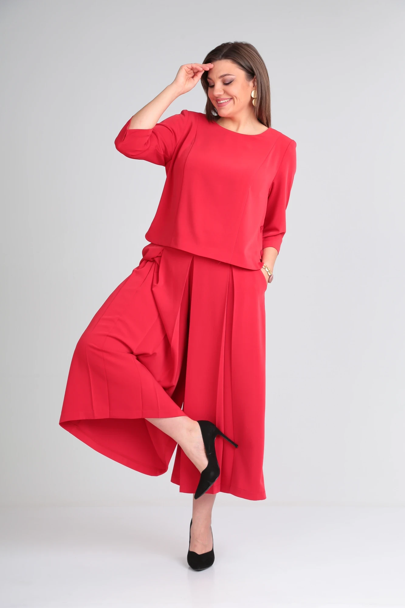 Блуза прямого силуэта с округлой горловиной и застежкой на пуговицу и петлю. Спинка в блузе разрезная. Рельефы по линии груди от плеча зрительно сужают фигуру. В боковых швах блузы расположены шлицы на застежку петли-пуговицы. Рукав двухшовный прямой, длиной ¾, с разрезом по локтевому шву. Юбка-брюки с широким поясом-обтачкой и застежкой на потайную молнию в боковом шве. По переду кюлот расположены глубокие бантовые складки, а в боковых швах -карманы.