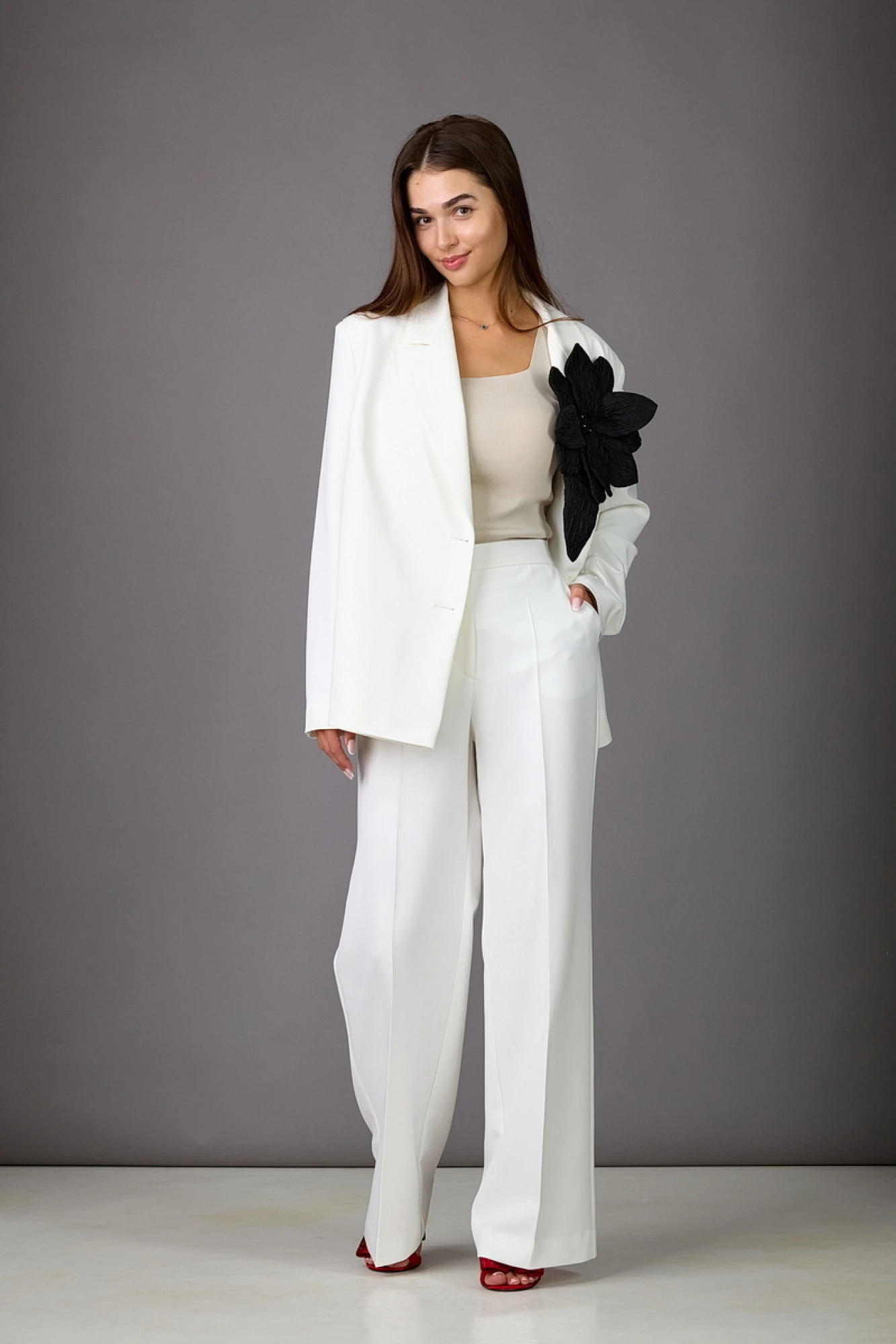 Комплект женский, состоящий из жакета и брюк, выполнен из стрейчевой костюмной ткани на подкладке. Двубортный жакет прямого силуэта с вытачками по переду. Карманы с листочками. Воротник - пиджачного типа. В среднем шве спинки - планка, застегивающаяся на пуговицы. Рукава - втачные, двухшовные. Застежка на 2 пуговицы и одну потайную. Цветок-брошь входит в комплект. Широкие брюки с поясом и карманами. По бокам пояса-резинка.Застегиваются по переду на молнию и пуговицу.