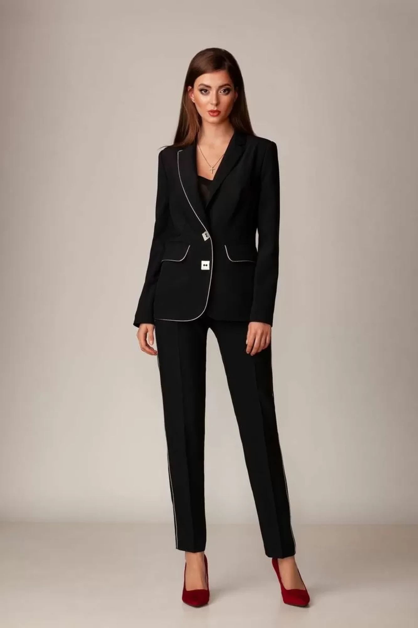 Классический брючный костюм из костюмной ткани на подкладке. Жакет приталенного силуэта с прорезными карманами с клапанами по переду. Воротник-английский, рукава - двухшовные. Застегивается на две пуговицы. Брюки слегка заужены к низу, с поясом. Застегиваются на молнию по переду и одну пуговицу. Кант из серебряной кожи по краю борта, клапанам и боковым швам брюк добавит стиля и элегантности. Длина жакета по спинке 67 см, длина рукава 63 см, длина брюк 99 см.
