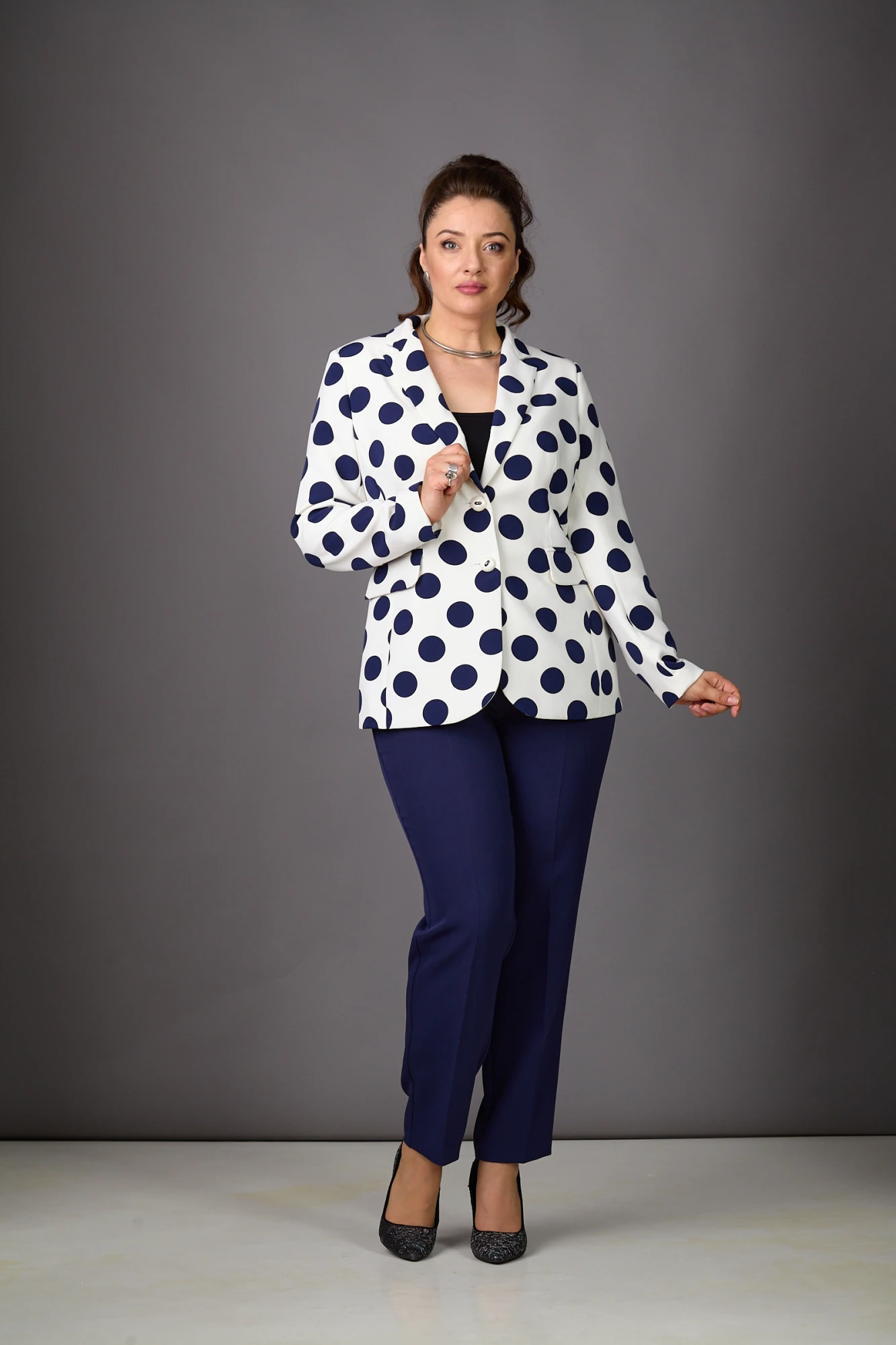 Эффектность и современный шик - горохи снова в тренде! Комплект из стрейчевой костюмной ткани на подкладке, состоящий из жакета и брюк. Жакет приталенного силуэта с карманами с клапанами по переду. Воротник с лацканами пиджачного типа, рукава - втачные, длинные. Застежка на пуговицы. Брюки со средней посадкой, зауженные к низу, с карманами и регулируемым резинкой поясом. Застегиваются на молнию и пуговицу.