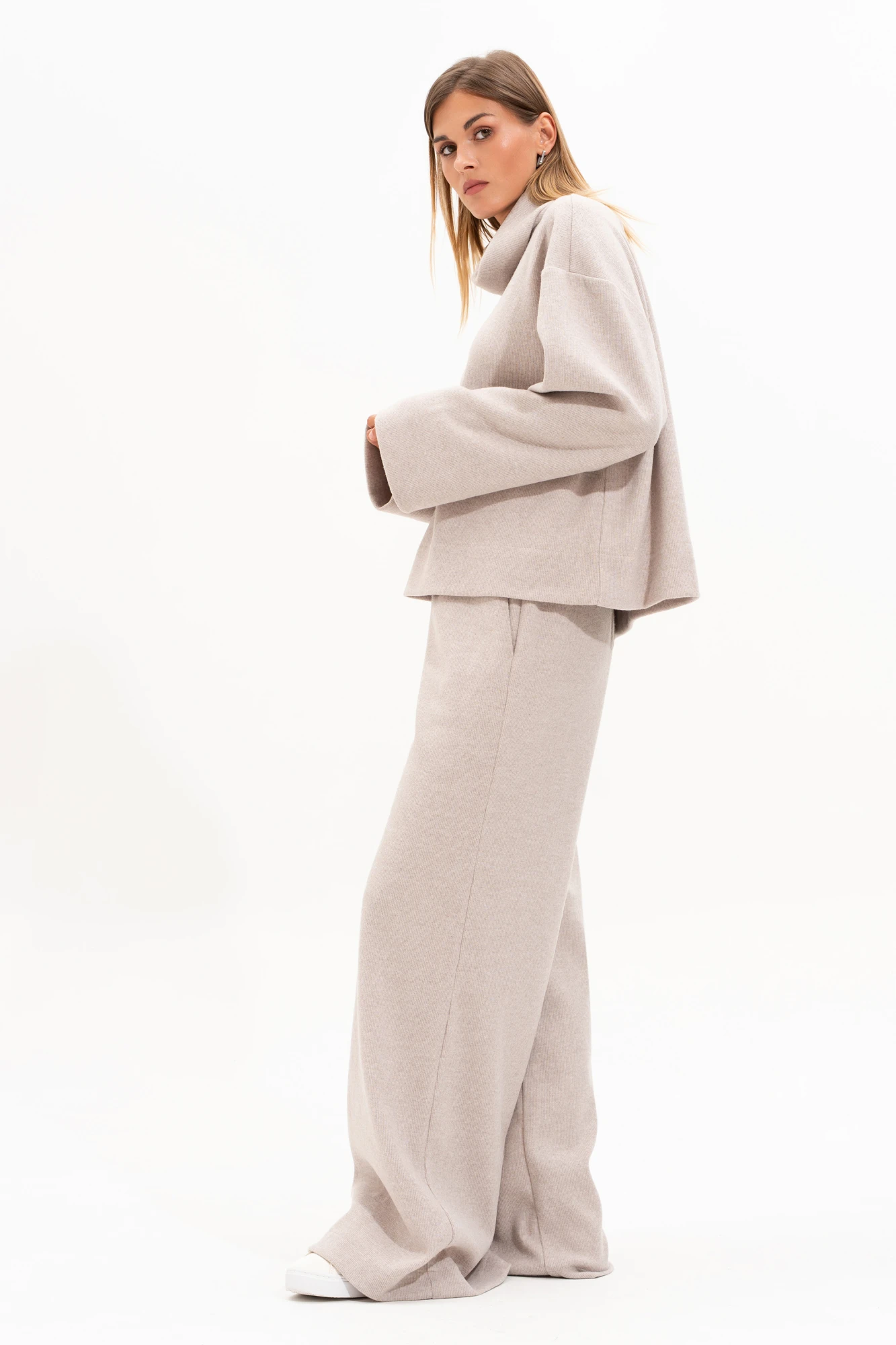 Длина джемпера по центру спинки 56 см. Длина рукава от горловины 73 см. ( длина плечевого шва 20 см + длина рукава от проймы 53 см.) Высота стойки 19 см. Ширина по низу в полуобхвате +-63 см. ( 44р ) Ширина рукава в полуобхвате +-18 см. ( 44р. ) Длина брюк с поясом +- 110см Ширина брюк по низу в 44 р. 37 см в полуобхвате. Параметры брюк в готовом виде в 44 р.: обхват талии 67 см, обхват бедер 110 см.
