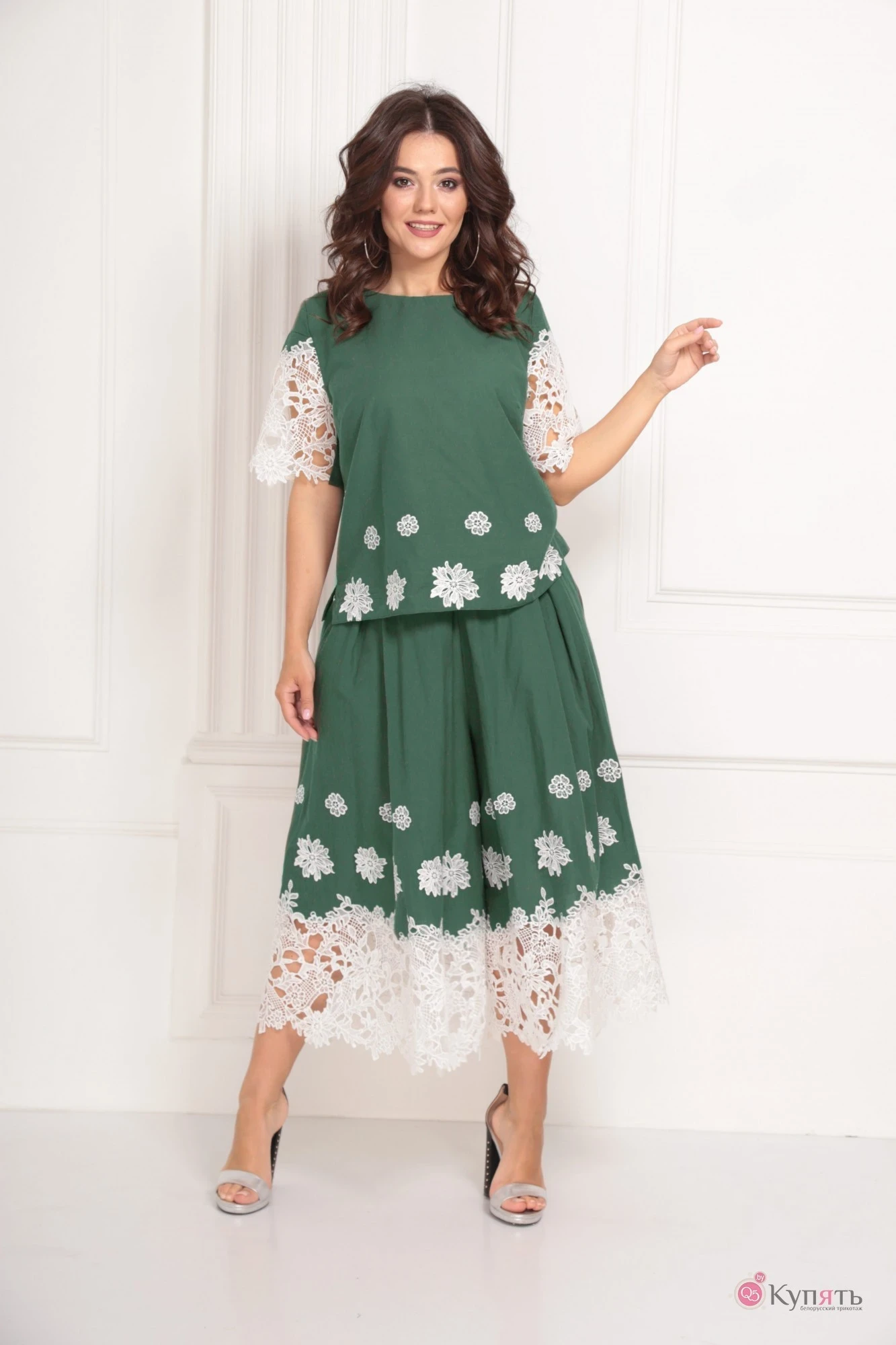 Комплект женский двух предметный предназначен для стильных молодых женщин идущих в ногу с модой. Комплект состоит из юбки-брюк (кюлоты) и блузы свободного кроя с нагрудными выточками. Горловина изделия круглая. Рукав втачной, выполнен из кружевной ткани. По низу полочки вышивка. Верх брюк на притачном поясе по бокам со вставной резинкой. Застежка- потайная молния. По переду брюк три бантовых складки. Длина брюк 7/8. От линии талии складки застрочены на 4 см. По низу брюк красивое шитье. Изделие выполнено из хлопковой ткани с вышивкой.
