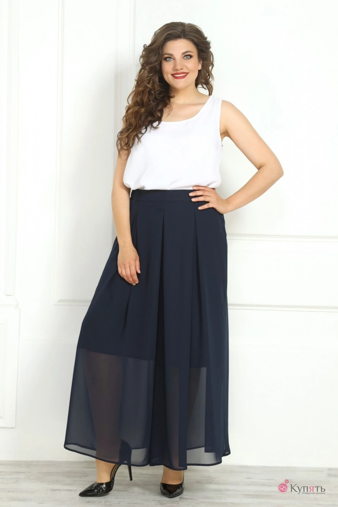 Супермодный женский комплект состоит из топа и юбки-брюк(кюлот). Юбка-брюки (кюлоты) из шифона. Верх брюк на притачном поясе по бокам со вставной резинкой. Застежка- потайная молния. По переду брюк три бантовых складки, а по спинке 2 бантовые складки. Кюлоты на хлопковой подкладке. Длина брюк 7/8. От линии талии складки застрочены на 4 см. Длина брюк по боковому шву-103см. .Топ женский из шифоновой ткани. По переду нагрудные выточки. Горловина округлая, без рукавов. Подойдет для женщин разной возрастной категории.