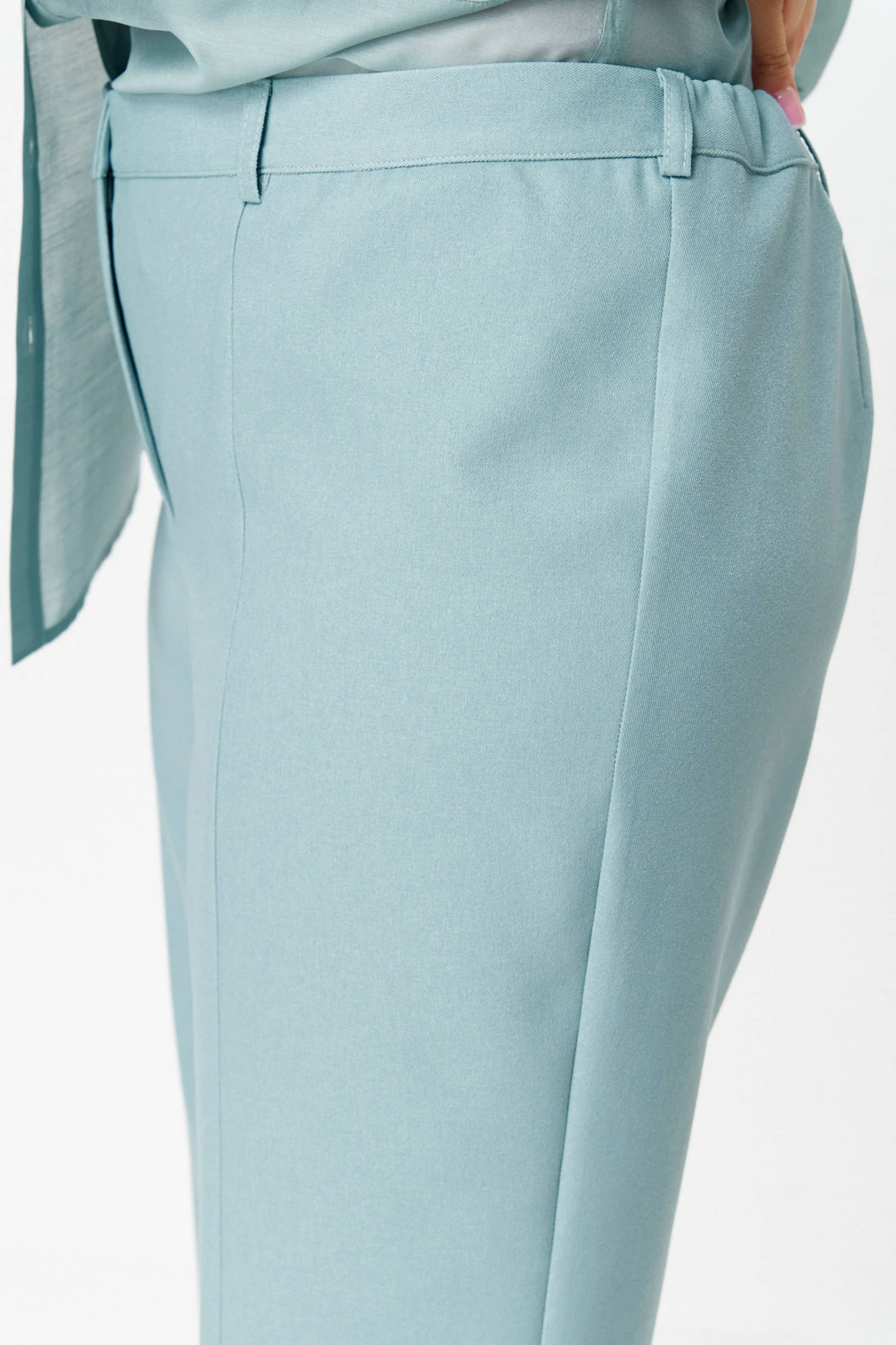 Брюки на притачном поясе со шлевками. На передних половинках брюк расположены рельефы с маленькими разрезами по низу. По спинке в пояс вставлена резинка. Застежка на молнию и пуговицу.
