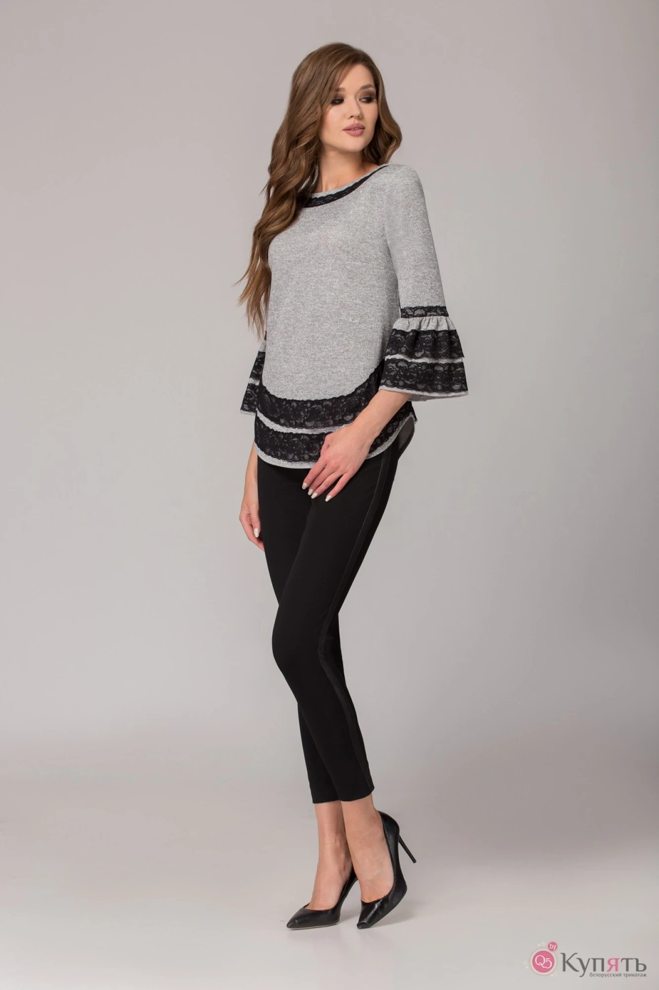 Комплект женский, состоящий из блузки и брюк. Блузка свободного силуэта с фигурным низом. Рукав втачной одношовный длиной ¾ с воланом на сборке. Полочка с нагрудными вытачками. Горловина спинки имеет V-образный вырез. Отделочным элементом блузки служат притачные кружева. Брюки длиной 7/8 заужены книзу. В боковых швах лампасы из отделочной ткани. Пояс брюк широкий трикотажный.