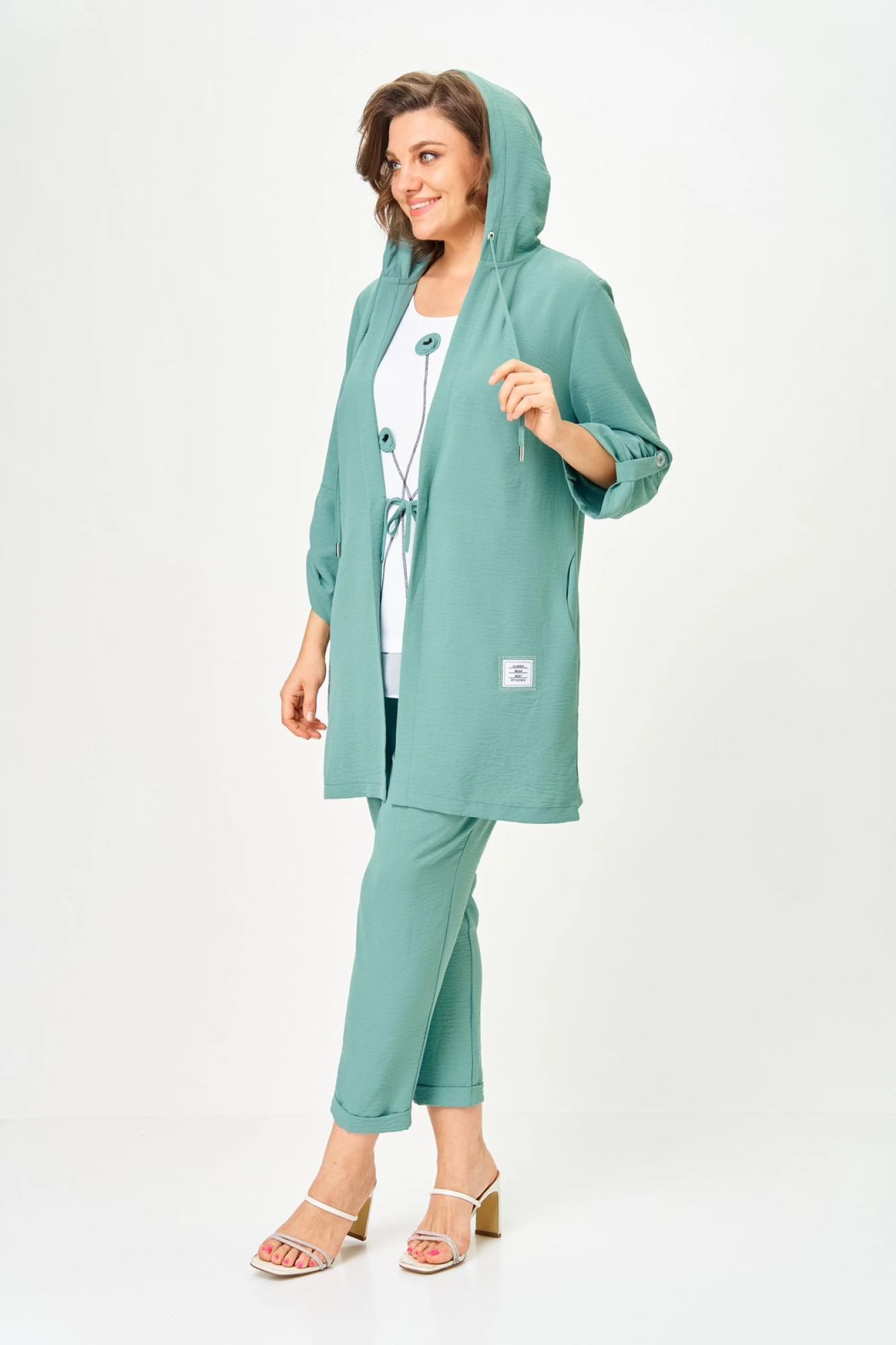 Кардиган прямого силуэта с втачным рукавом. По горловине капюшон со шнурком. Рукава кардигана фиксируются на верх патой. Сборка по рукаву зафиксирована. В боковых швах обработаны карманы и разрезы.