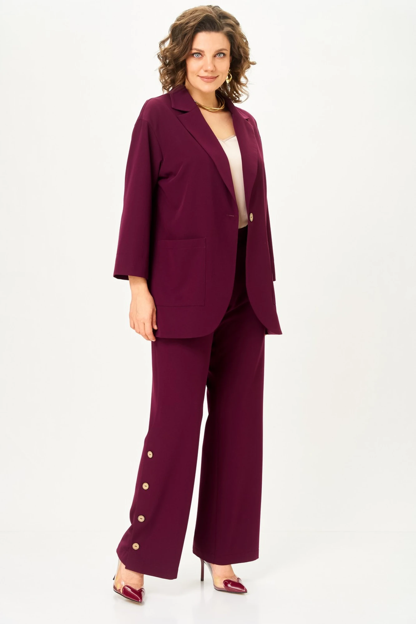 Брюки прямого силуэта с декоративной застежкой по низу в боковых швах. Передние половинки брюк с карманами. Брюки с застежкой на молнию, по поясу на петлю и пуговицу. По бокам резинка для удобства посадки на талии. Костюм без подкладки.