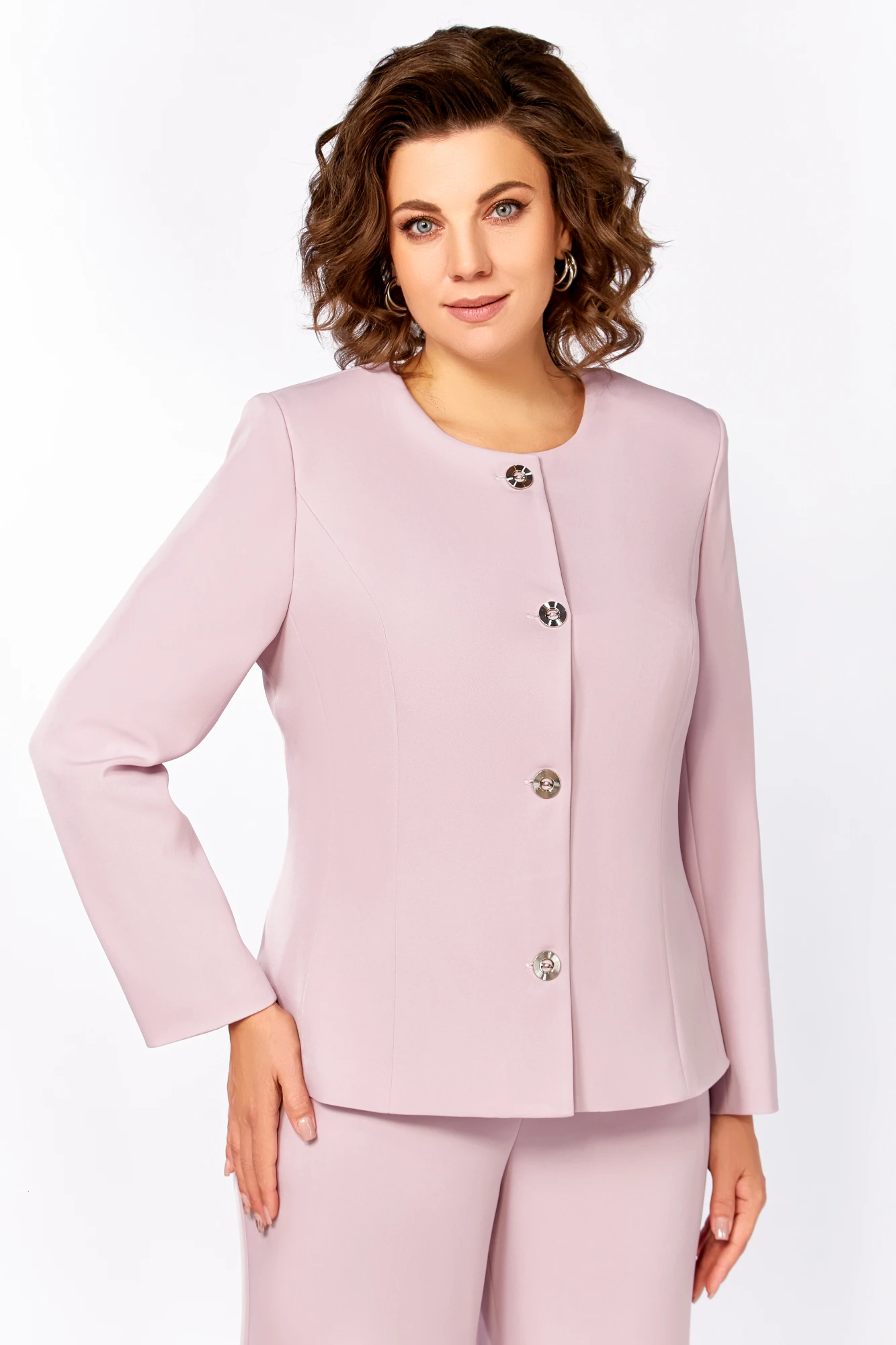 Жакет однобортный на подкладке, с центральной застёжкой на петли и декоративные пуговицы. По переду рельефы и отрезные бочки, по спинке - рельефы и средний шов. Горловина круглая. Рукав втачной двухшовный.