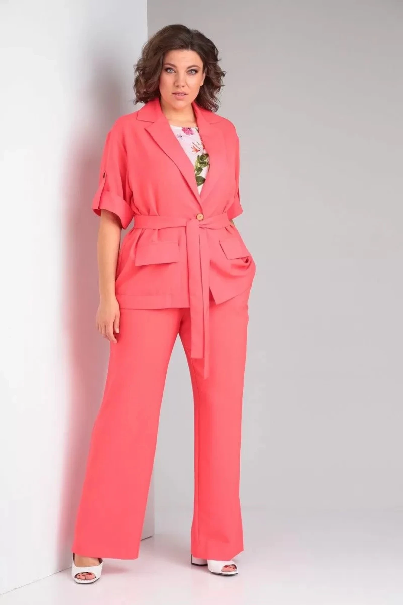 Жакет без подкладки из костюмной ткани свободного силуэта, со съемным поясом, слегка спущенной линией плеча, коротким рукавом, лацканами, отложным воротником, центральной бортовой застежкой на петли и пуговицы. Перед с клапанами. Рукав втачной одношовный, с обтачкой и патой с застежкой на петли и пуговицы. Брюки из костюмной ткани свободного силуэта, прямые с карманами в боковых швах, на поясе с резинкой.Блуза из трикотажного полотна с принтом, свободного силуэта, со спущенной линией плеча и круглым вырезом горловины.