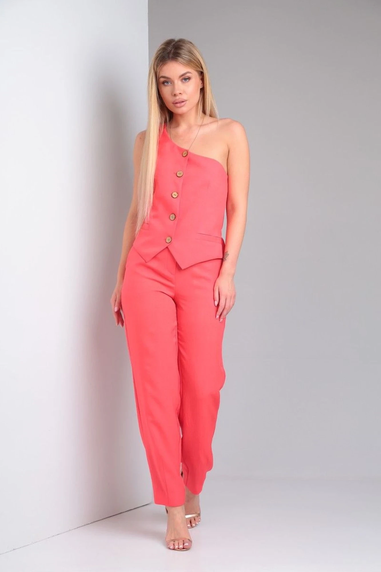 Жилет на подкладке из костюмной ткани, полуприлегающего силуэта, со спущенным плечом, центральной бортовой застежкой на петли и пуговицы. Перед с талиевыми вытачками и листочками. Спинка со средним швом и хлястиком.