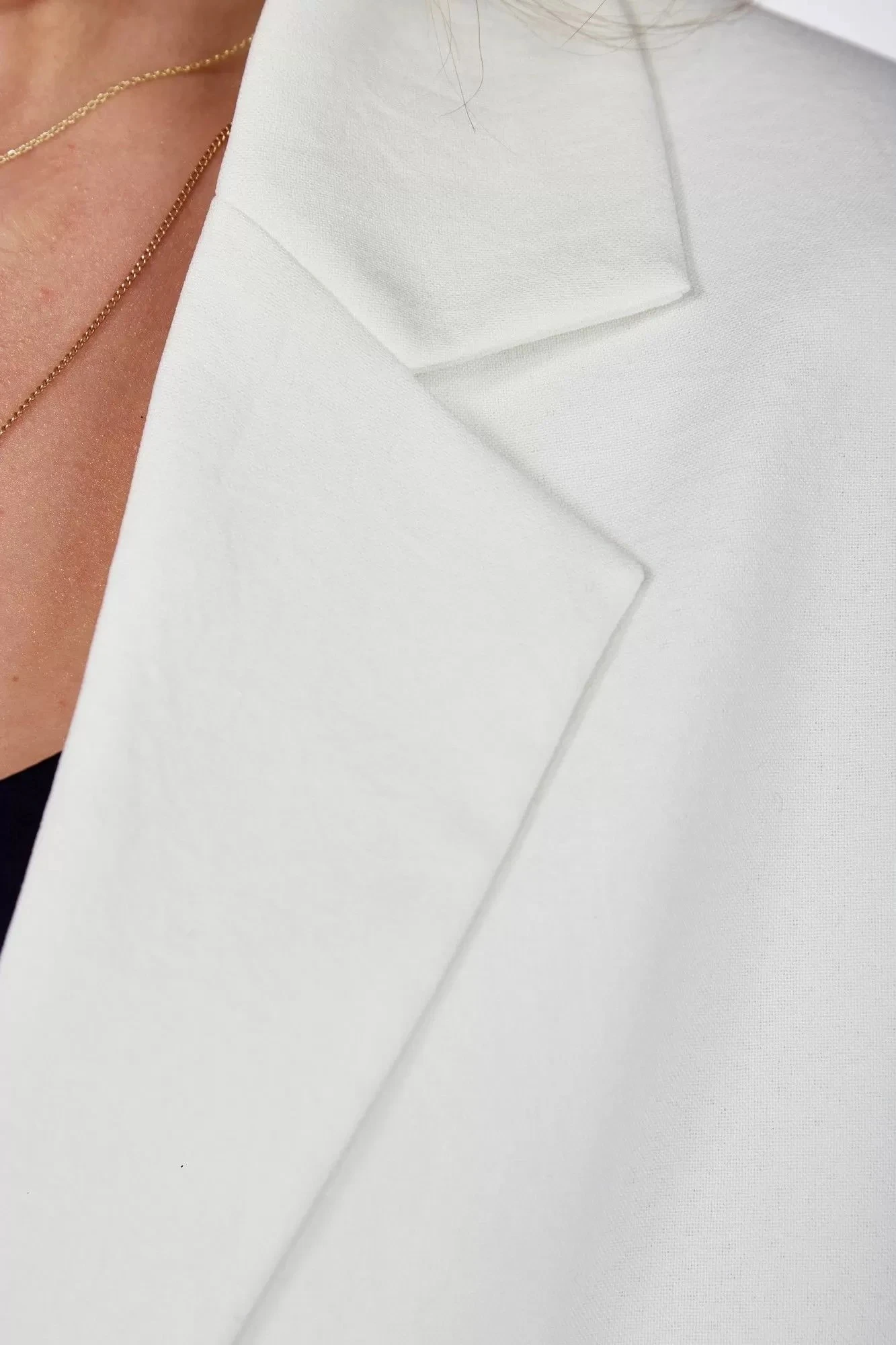 Жакет укороченный из костюмной ткани на подкладке, свободного силуэта, двубортный, с лацканами и воротником пиджачного типа, с застежкой на петли и пуговицы. Рукав втачной двухшовный. Длина по спинке 45 см. Длина рукава 62 см.
