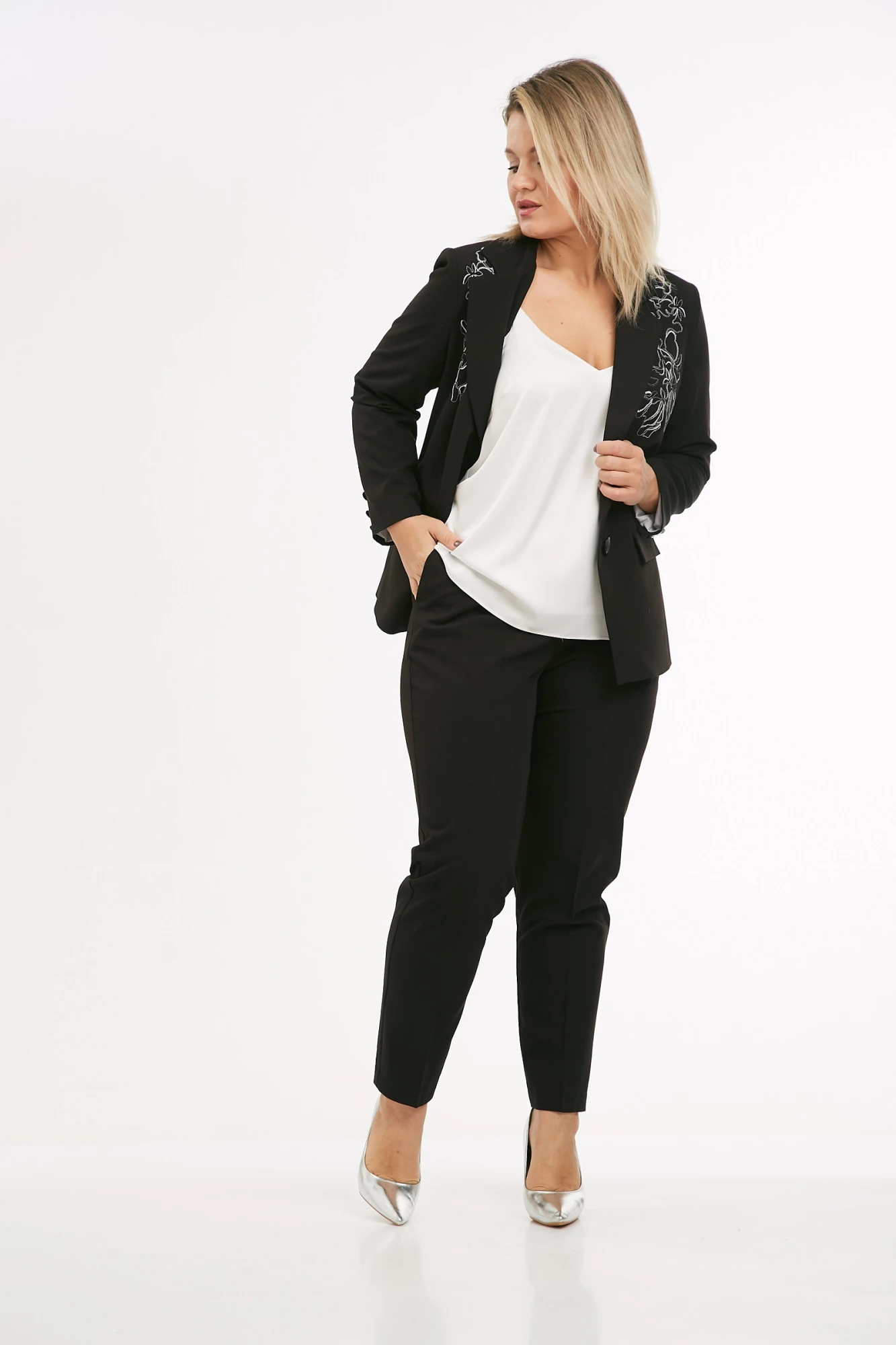 Жакет из костюмной ткани на подкладке, полуприлегающего силуэта, с отложным воротником и лацканами, с центральной бортовой застежкой на петли и пуговицы. Перед с талиевыми вытачками, прорезными карманами с клапаном и вышивкой в области груди. Спинка со средним и рельефными швами. Рукав втачной двухшовный. Воротник отложной пиджачного типа.