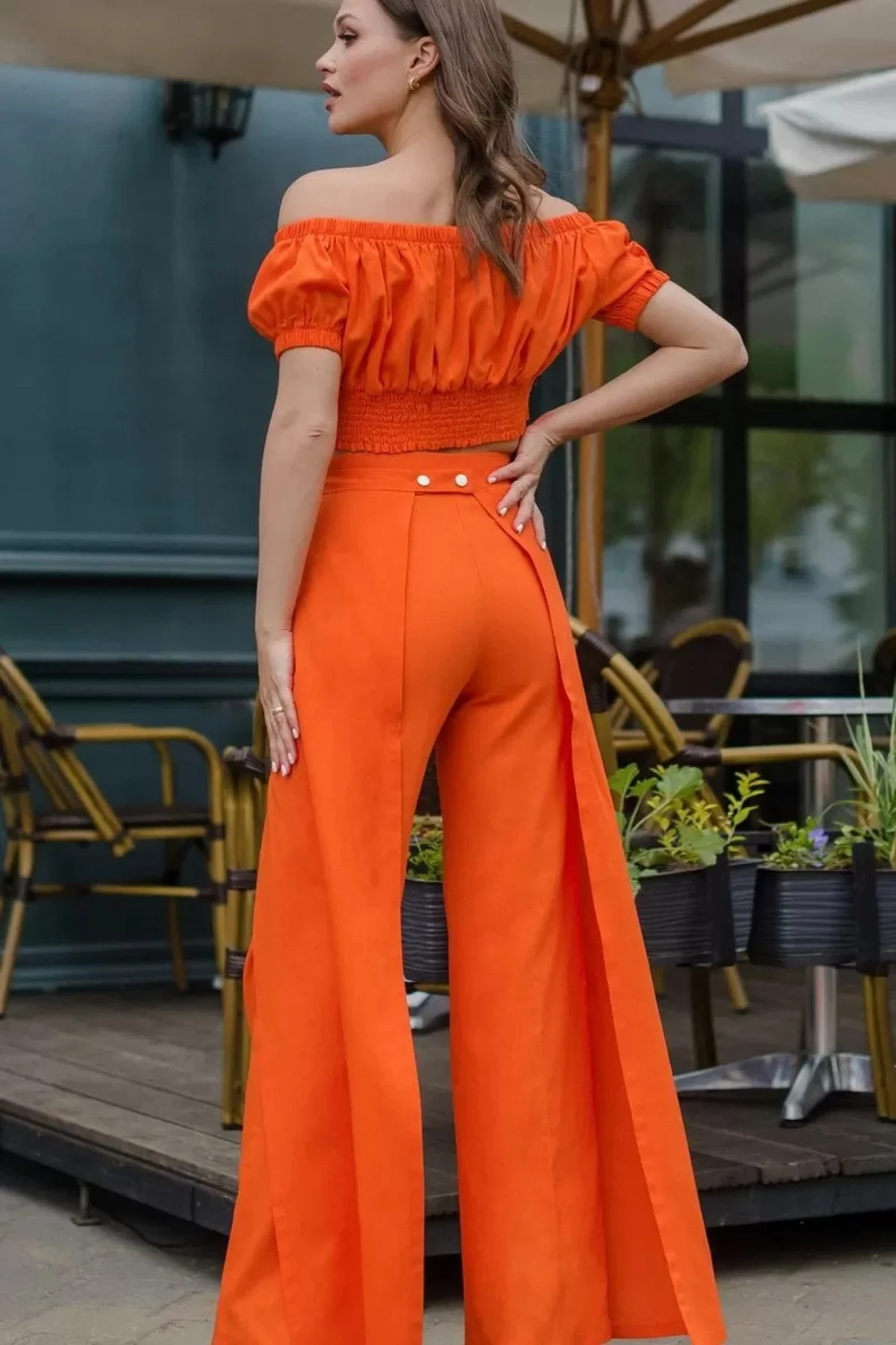 Брюки расширенные к низу на притачном поясе с застежкой на тесьму молнию в левом боковом шве.