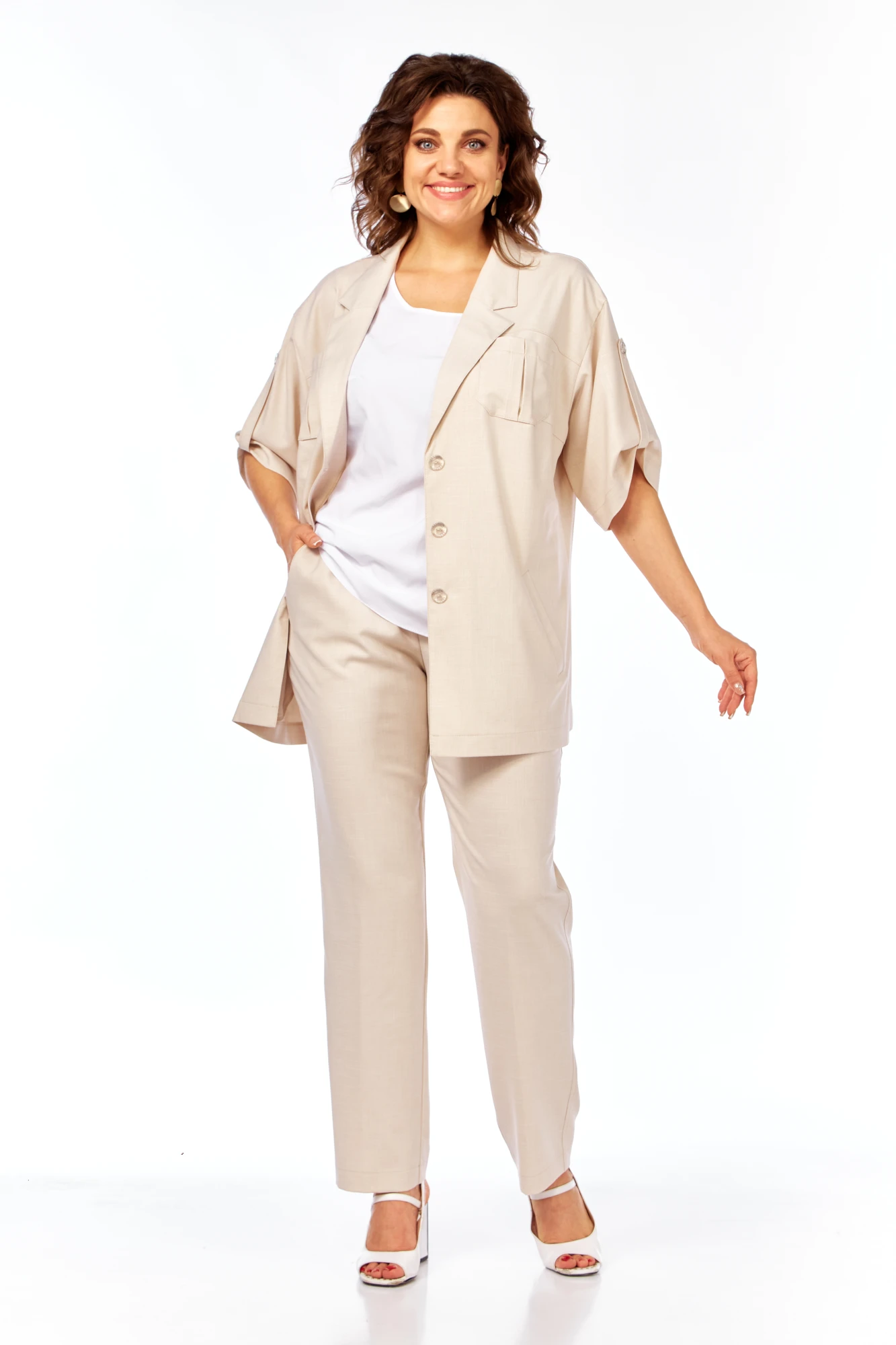 жакет и брюки — 64% вискоза, 34% полиэстер, 2% эластан; блуза — 70% полиэстер, 26% вискоза, 4% эластан.