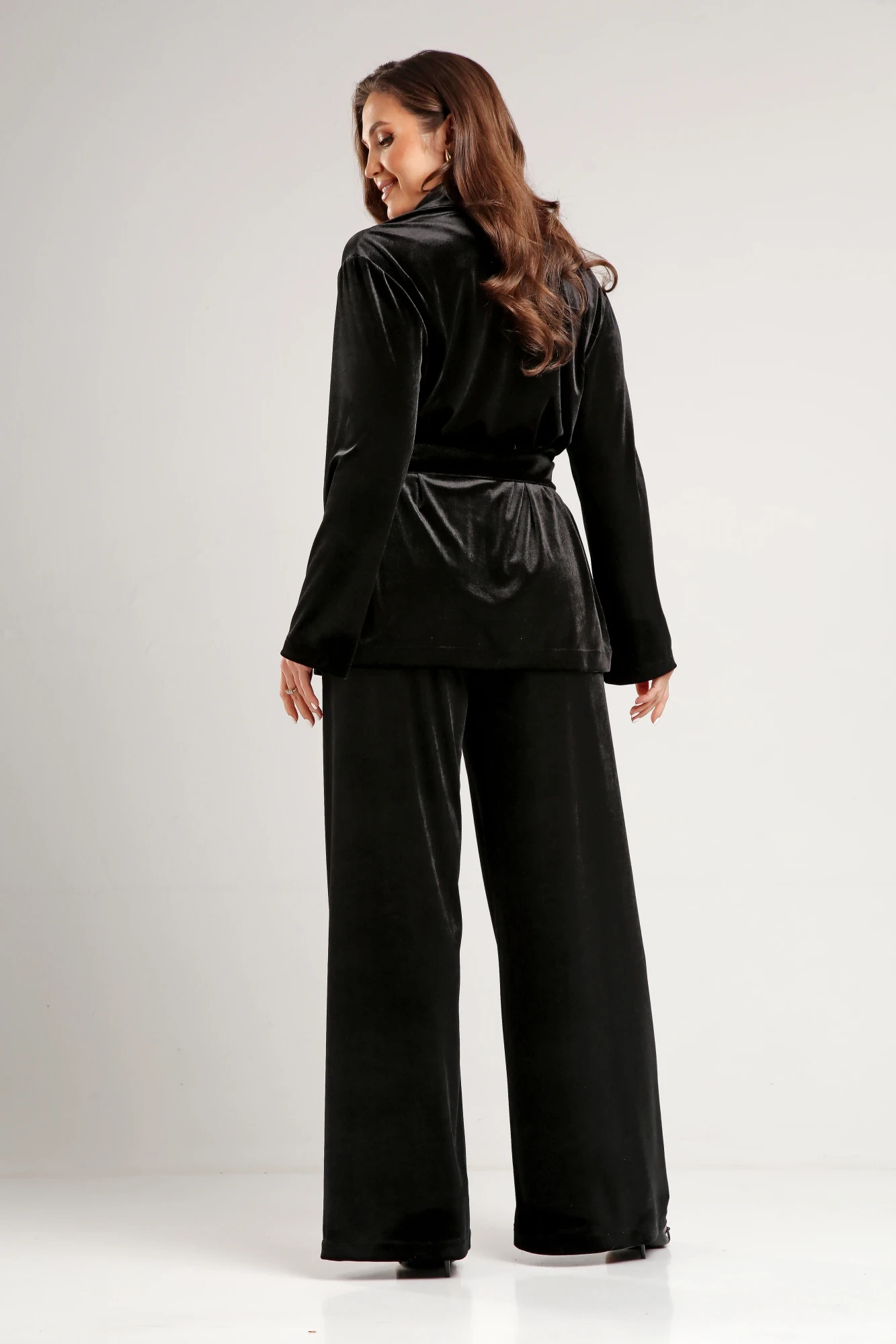 Комплект состоит из жакета и брюк из бархата. Легкий жакет из бархата дополнит ваш праздничный образ или повседневный .Жакет прямого кроя на запах под пояс, без пуговиц, без подкладки , спинка без среднего шва. Отделочные строчки по борту воротника и поясу на 0,7 мм. Длина по спинке 74 см, длина рукава 61 см. Его можно сочетать с брюками, юбками, джинсами можно одевать поверх платья или сарафана, миксуя с различной обувью и добавляя аксессуары. Брюки свободного кроя из бархатной ткани - это не только модель для праздника. Данную модель можно сочетать с рубашкой, блузкой, жакетом из бархата арт. 2363 дополнить образ различными аксессуарами, обувью на плоской подошве, обувью на шпильке ,также подойдут кеды или кроссовки для более повседневных образов в сочетании с футболкой. Талия высокая, брюки на резинке , длина по боковому шву 110 см.