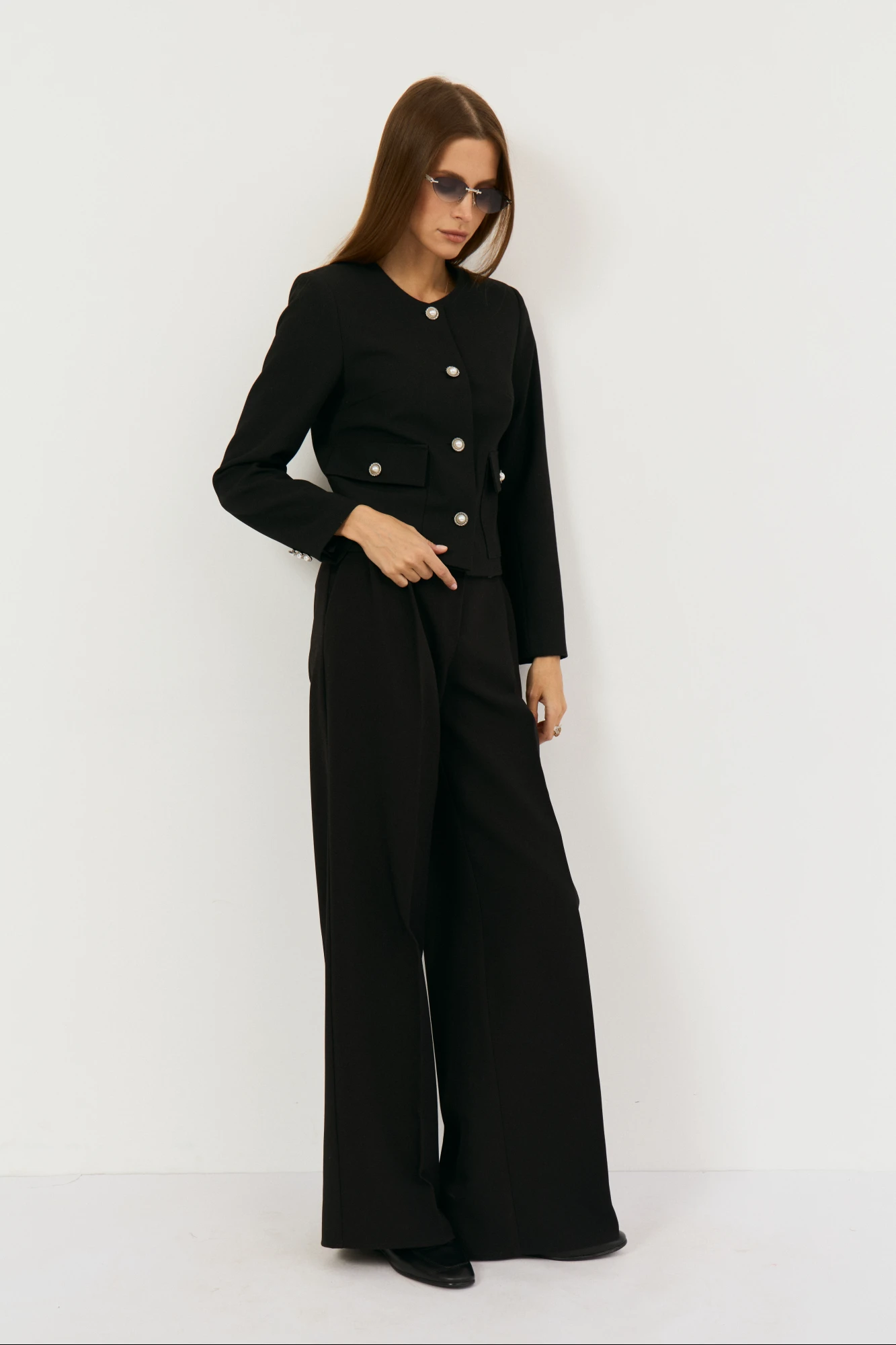 "Комплект из жакета и брюк. Жакет укороченный, прямого силуэта, с втачными рукавами , горловина округлой формы, без воротника.По бокам накладные функциональные карманы с застежкой на петлю-пуговицу. Застёжка жакета центральная однабортная на петли и пуговицы. спинка со средним швом и рельефами без шлиц и пуговиц. Жакет на подкладке.