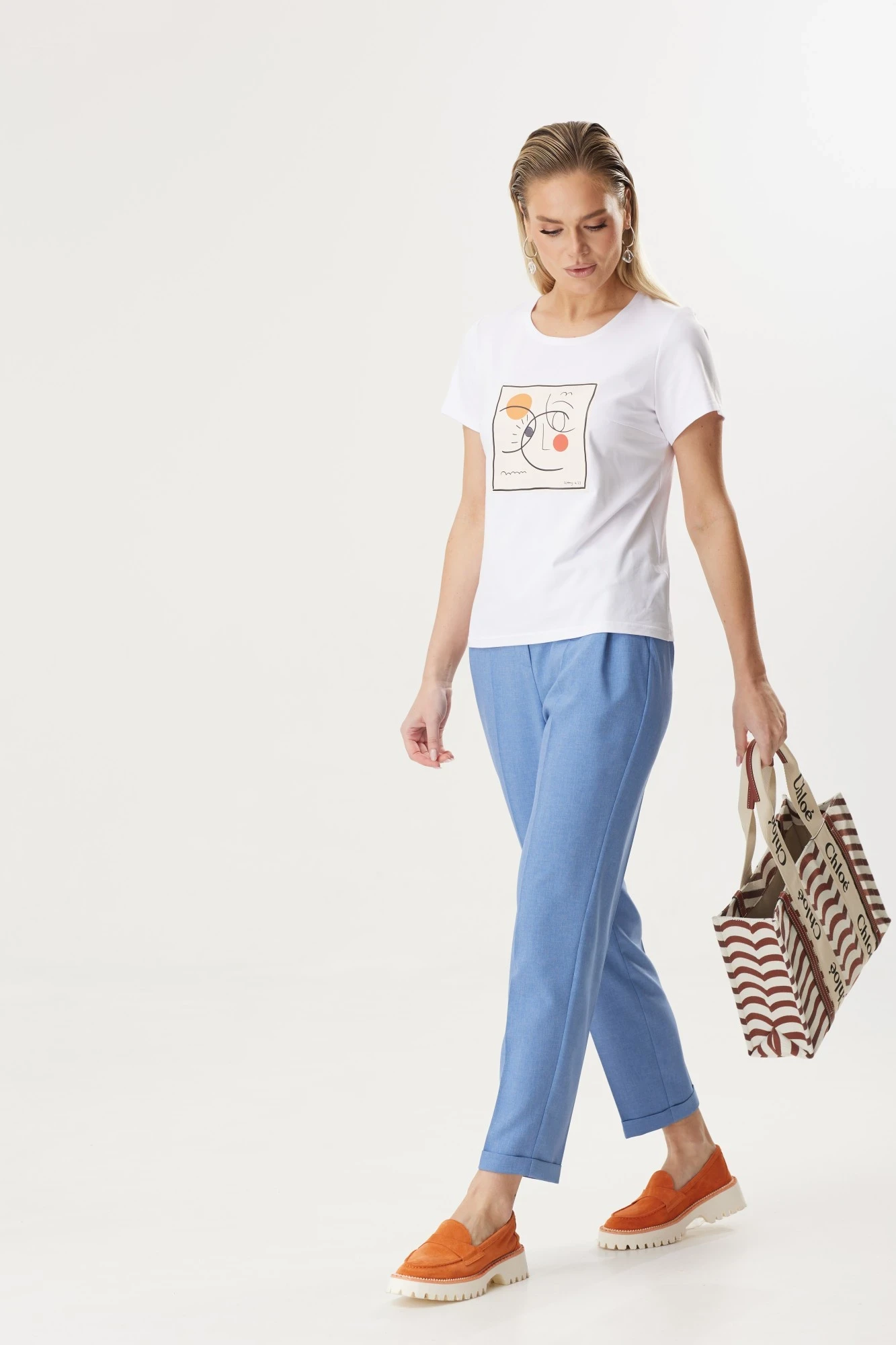Брюки классической формы, зауженные к низу со стрелками по передним и задним половинкам. По низу брюк манжеты. Верхний срез брюк обработан поясом с резинкой по боковым швам. На задних половинках расположены талиевые вытачки, в боковых швах – наклонные карманы. Перед обработан поясом фигурной формы и декоративным клапаном, на котором пришита пуговица. Блуза выполнена из хлопкового трикотажного полотна прямого силуэта. Она дополнена нагрудными вытачками и коротким втачным рукавом. По переду майки расположен стильный принт, который подчеркнет уникальность образа.