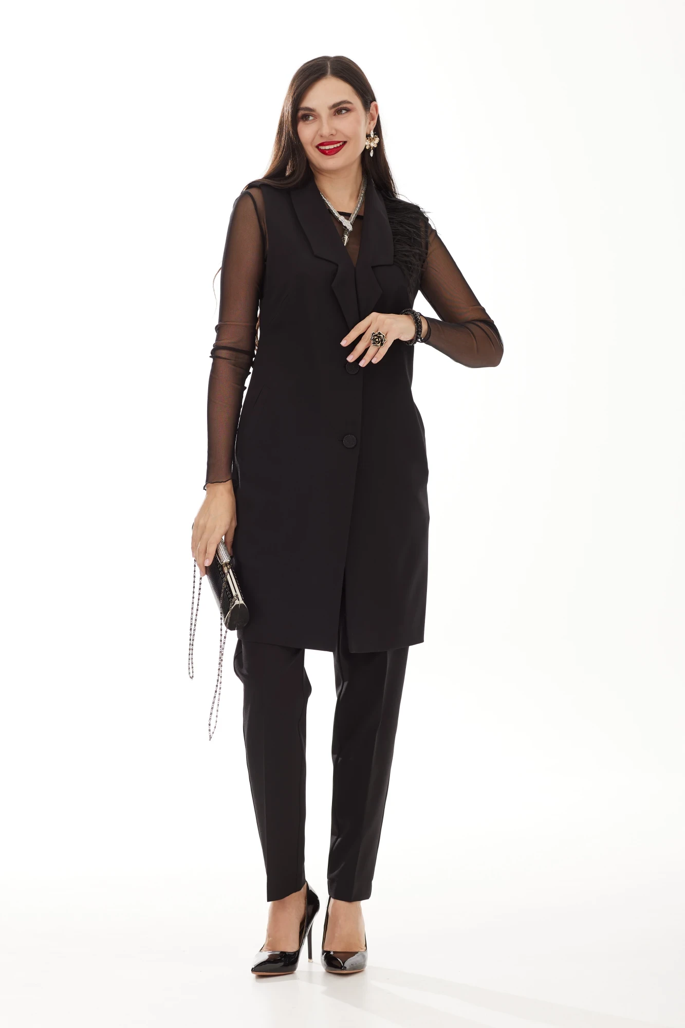 Стильный брючный двухпредметный костюм от бренда Твой Имидж выполнен из качественной костюмной ткани - модный тренд сезона. Женский костюм состоит из удлиненного жилета без подкладки и брюк. Костюм украшает съёмный декор "Перья", который фиксируется по внутренней стороне левого лацкана жилета на маленькие пуговки. Что делает этот костюм невероятно универсальным и многофункциональным! Его можно носить в комплекте или раздельно, дополнить блузкой для деловой встречи или футболкой для модной вечеринки. В таком костюме вы всегда будете чувствовать себя превосходно!