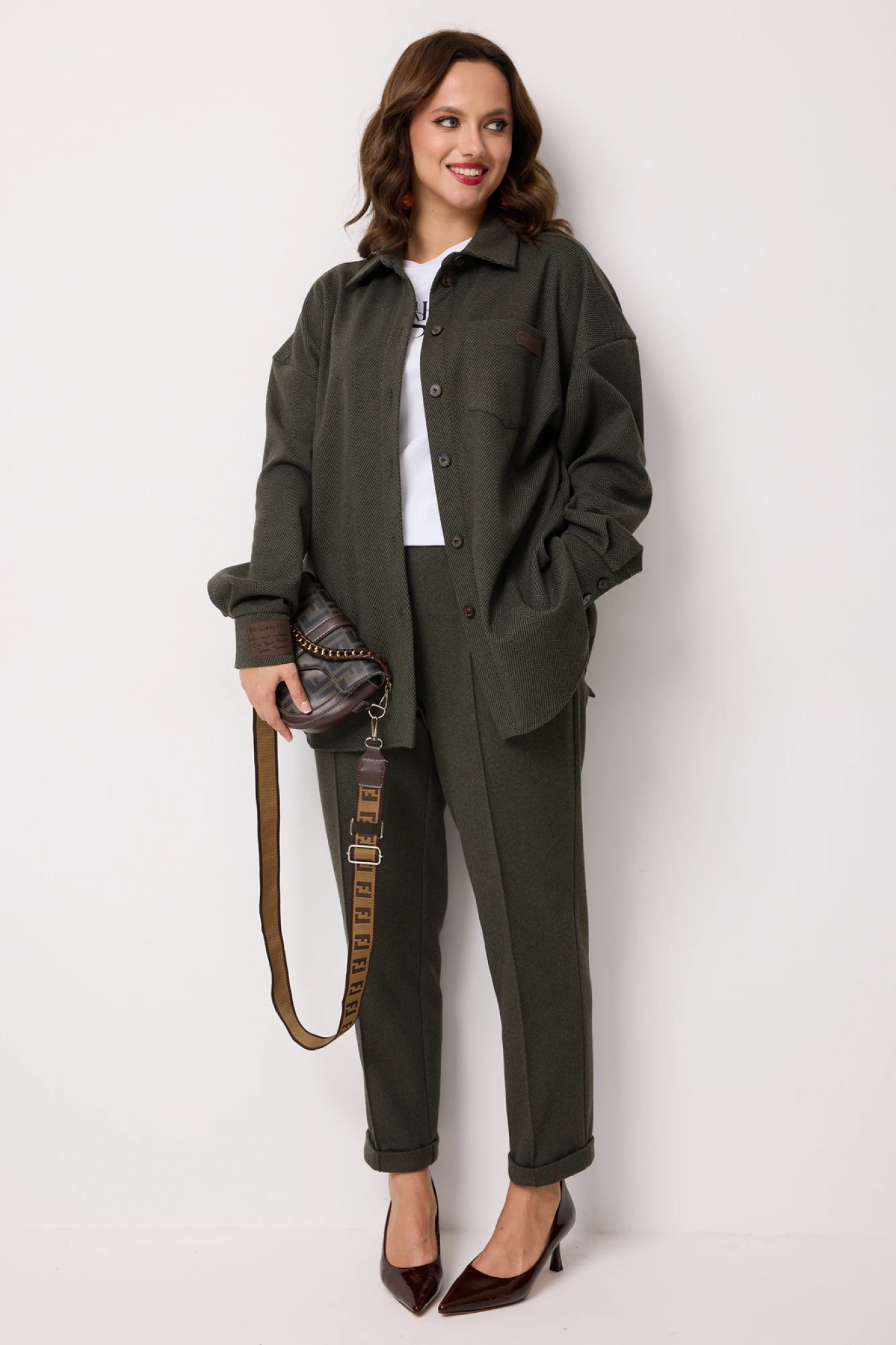 Комплект женский 2-х предметный, состоящий из блузы и брюк. Блуза выполнена из поливискозы с принтом "елочка". Блуза длиной до середины бедра, прямого силуэта, с центральной застёжкой на петли и пуговицы. Горловина рубашечного типа. Блуза со спущенной линией плеч. Рукава длинные, по низу обработана шлица и притачные манжеты, которые застёгиваются на 2 петли и пуговицы. На одной манжете настрочена декоративная нашивка. В области груди, с одной стороны, накладной карман с декоративной нашивкой. Спинка с кокеткой и со средним швом, в котором обработана шлица, застегивающаяся на 3 петли и пуговицы. Низ блузы закруглен. Брюки выполнены из полизивкозы однотонного компаньона. Брюки прямого силуэта, слегка заужены к низу. Низ брюк с цельнокроеной манжетой. Брюки с отстроченными по переду стрелками и заутюженными по задним половинкам. Верхний срез обработан притачным поясом, в который вставлена резинка. По центру переда - застёжка-обманка. В боковых швах расположены наклонные карманы.