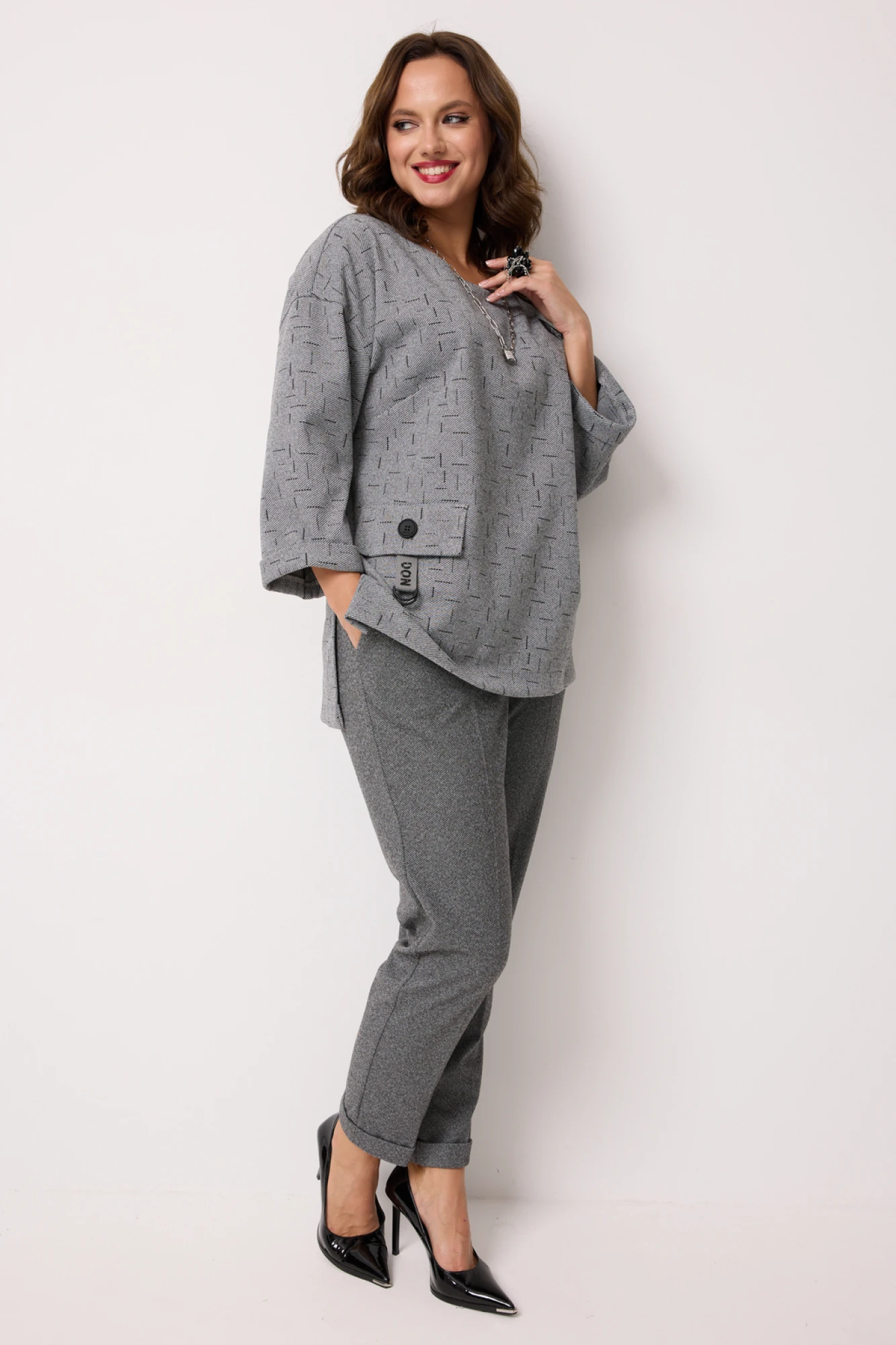 Костюм женский 2-х предметный, состоящий из блузы и брюк. Блуза выполнена из поливискозы с принтом "штрихи". Блуза длиной до середины бедра, прямого силуэта. Горловина круглой формы. Рукава двухшовные длиной 3/4, с манжетой. Перед с нагрудными вытачками, выходящими из бокового шва. В области груди расположена декоративная нашивка. В области бедра настрочен клапан с декоративной тесьмой и пряжкой, который зафиксирован пуговицей. Спинка со средним швом и декоративной шлицей с пуговицами в верхней части спинки. По низу боковых швов обработаны разрезы. Брюки выполнены из полизивкозы однотонного компаньона. Брюки прямого силуэта, слегка заужены к низу. Них брюк с цельнокроеной манжетой. Брюки со стрелками по передним и задним половинкам. Верхний срез обработан притачным поясом, в который вставлена резинка. По центру переда - застёжка-обманка. На задних половинках расположны талиевые вытачки. В боковых швах расположены наклонные карманы.