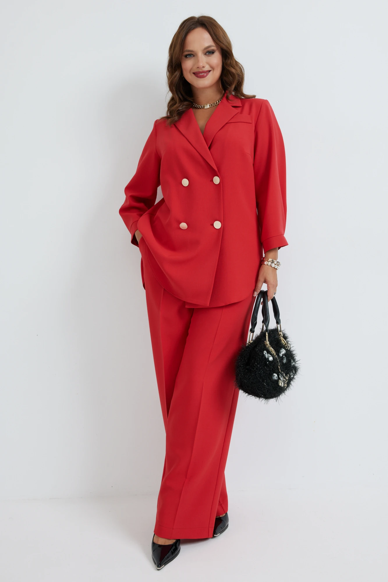 Костюм состоит из жакета и брюк. Качественная поливискоза, из которой выполнена модель, обеспечит долговечность изделию и приятные ощущения его обладательнице. Жакет без подкладки прямого силуэта, с двубортной застежкой на петли-пуговицы, длиной до середины бедра. Перед жакета с нагрудными вытачками, в области груди расположена декоративная листочка. Спинка с двойной кокеткой, в шве притачивания которой обработана встречная складка. Низ жакета фигурный, с закруглениями по боковым швам. Рукава двушовные, длиной 3/4, по низу с манжетой, застегивающейся на петлю и пуговицу. Горловина оформлена воротником пиджачного типа. Брюки классической формы, прямые от линии бедер, со стрелками по передним и задним половинкам. Верхний срез обработан поясом, в который от бокового шва вставлена резинка по задним половинкам. В боковых швах обработаны наклонные карманы. На задних половинках расположены талиевые вытачки. В комплект входит пояс из основной ткани.