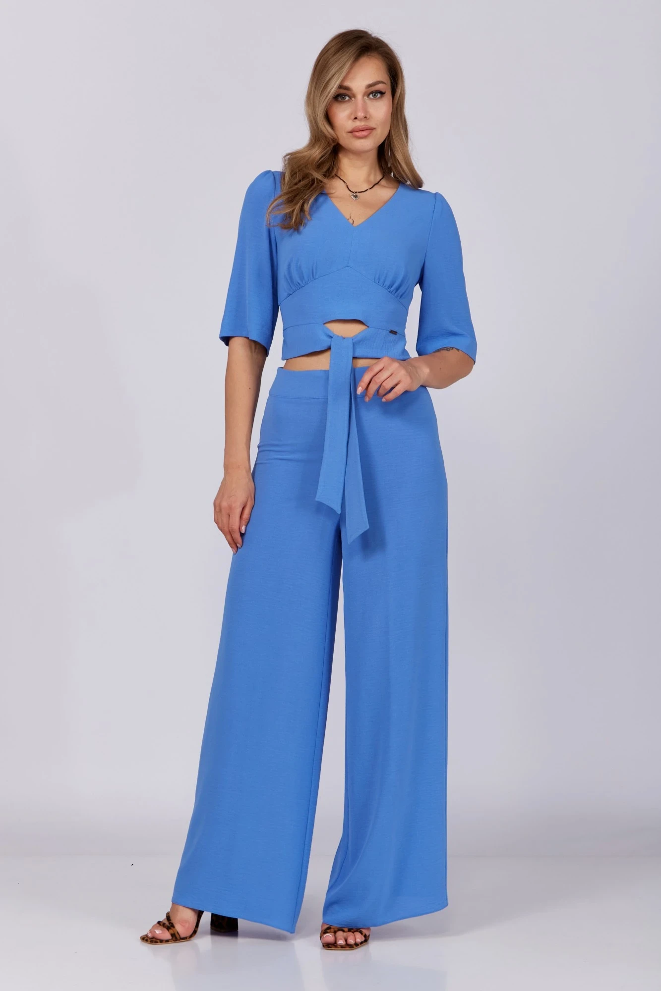 Комплект двойка состоящий из блузы и брюк. Укороченная блуза с V-образным вырезом. Отрезной декоративный пояс по талии с завязкой. Укороченный свободный рукав. В боковом шве молния.