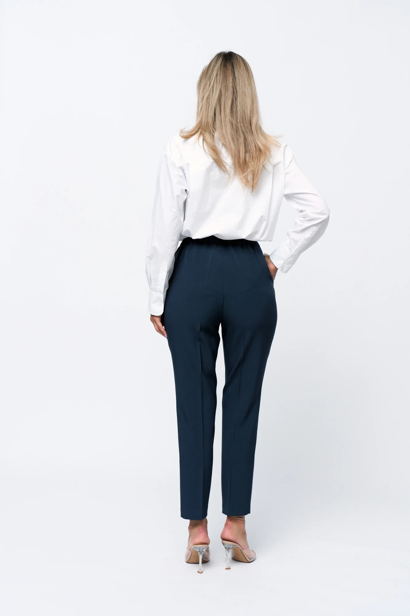 Брюки классические, на притачном поясе со шлевками. Карманы в боковых швах.