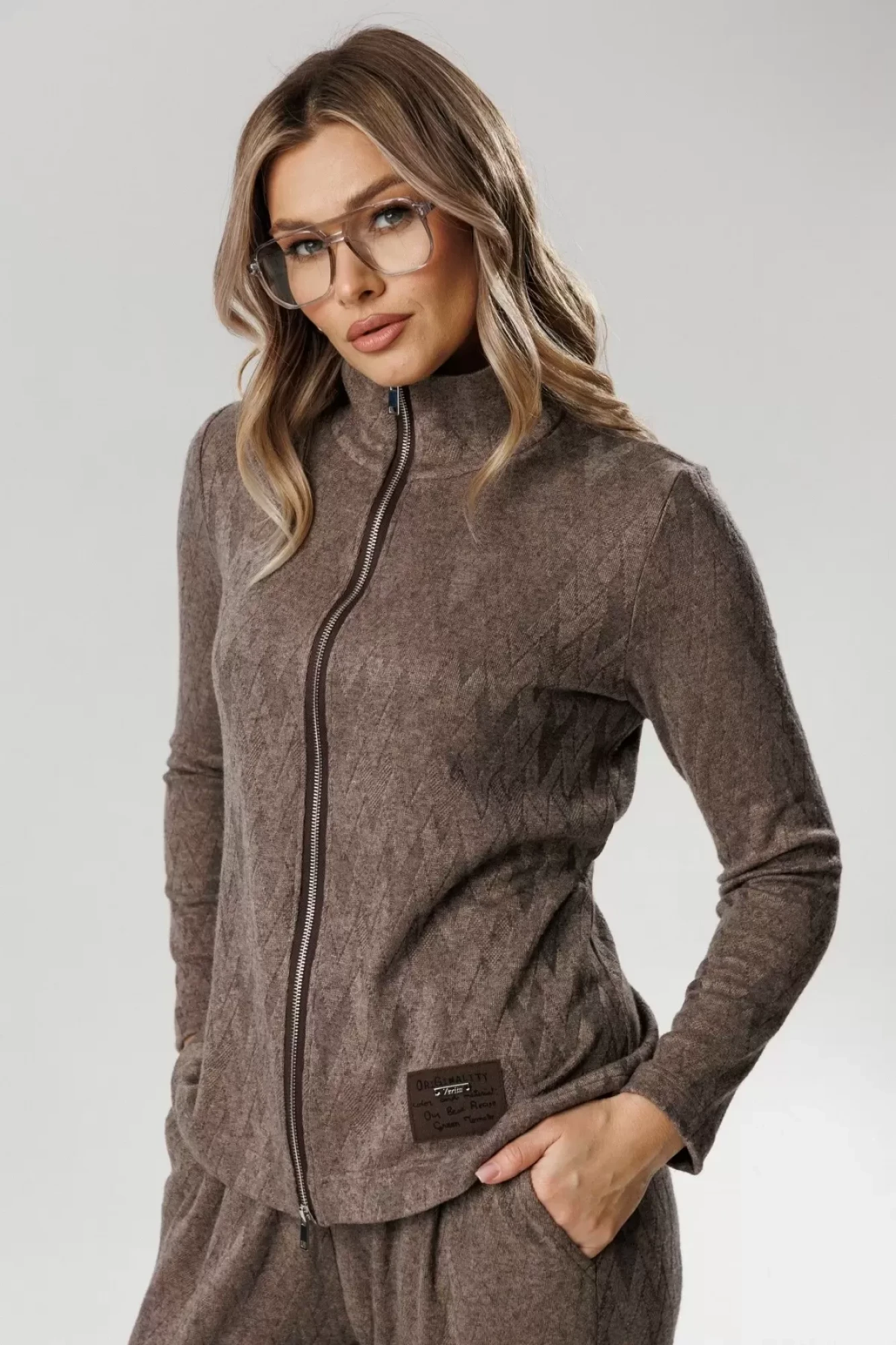 Джемпер полуприлегающего силуэта, с втачным длинным рукавом. Горловина со стойкой. По переду застежка на молнию.