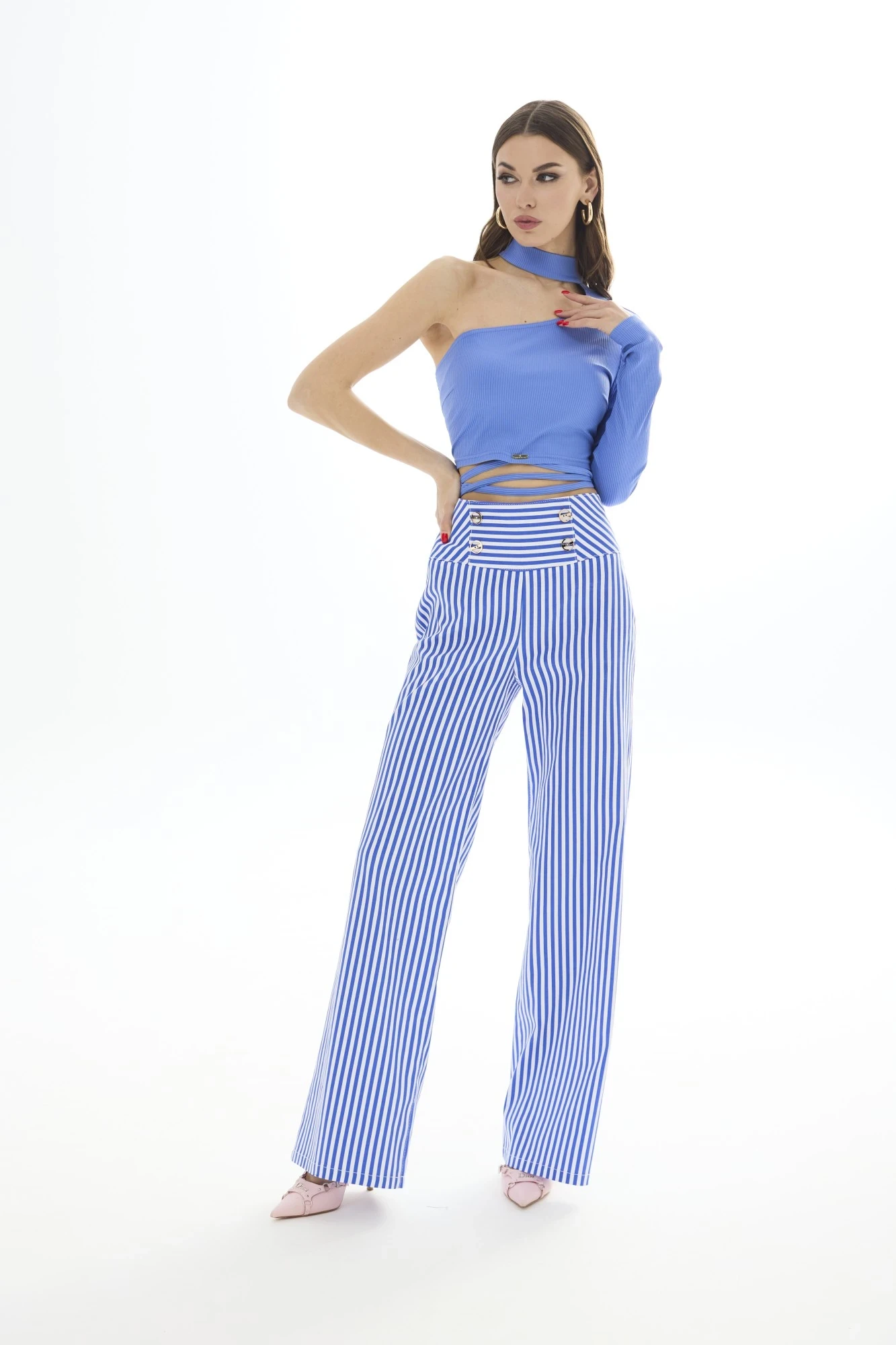 Комплект 2-х предметный: топ и брюки.Топ прилегающего силуэта с одним рукавом. Воротник-стойка. Асимметричный вырез горловины с открытым плечом.  По низу переда две завязки.Брюки прямые из хлопковой ткани. Верх на высокой кокетке. Застежка сзади на декоративную молнию. На кокетке передних частей брюк декоративные пуговицы.
